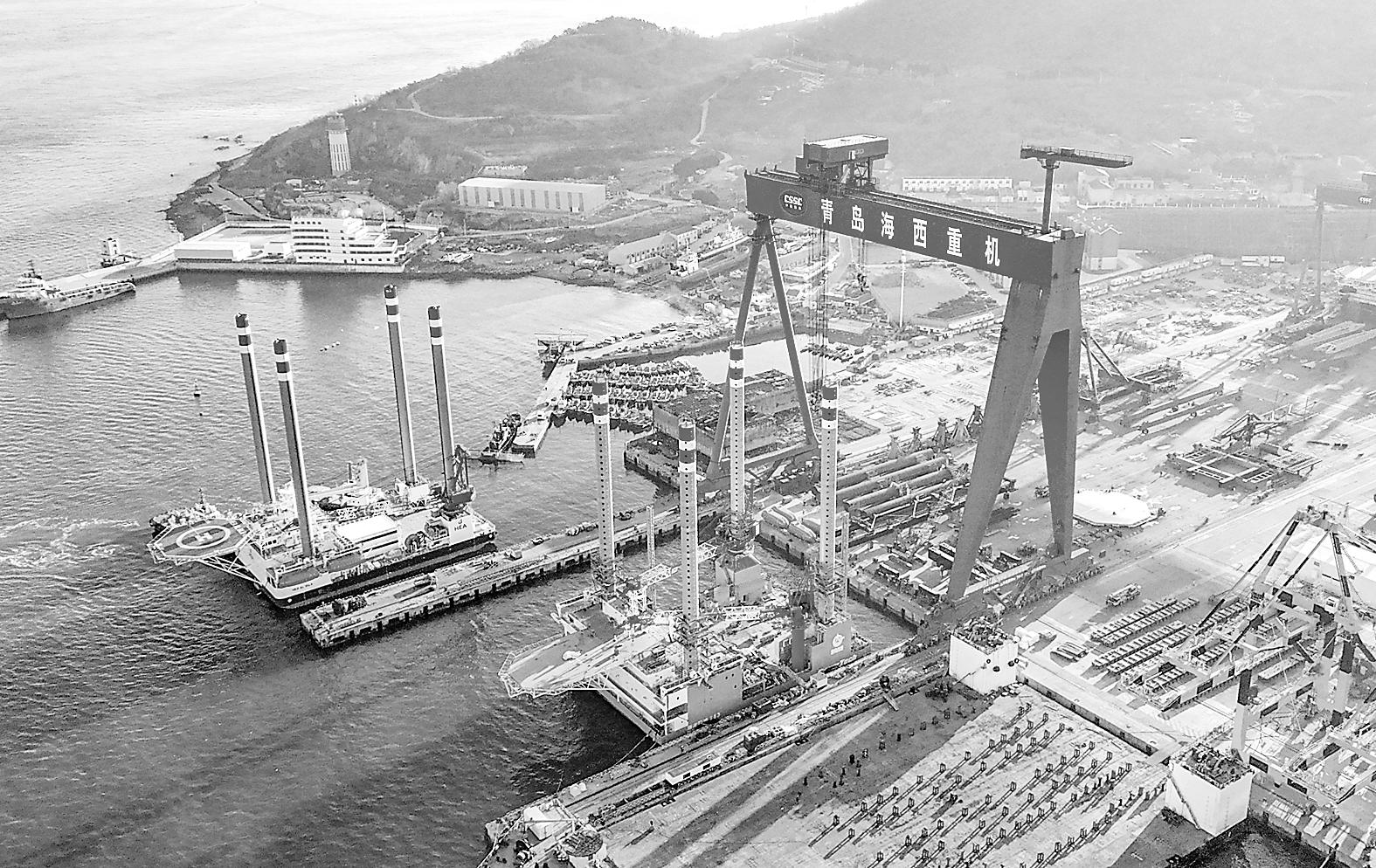 1月22日,由中船武汉船机海西重机自主设计建造的两座新一代自升式海上作业支持平台停靠岸边,准备从青岛西海岸新区发往中东(无人机照片)。