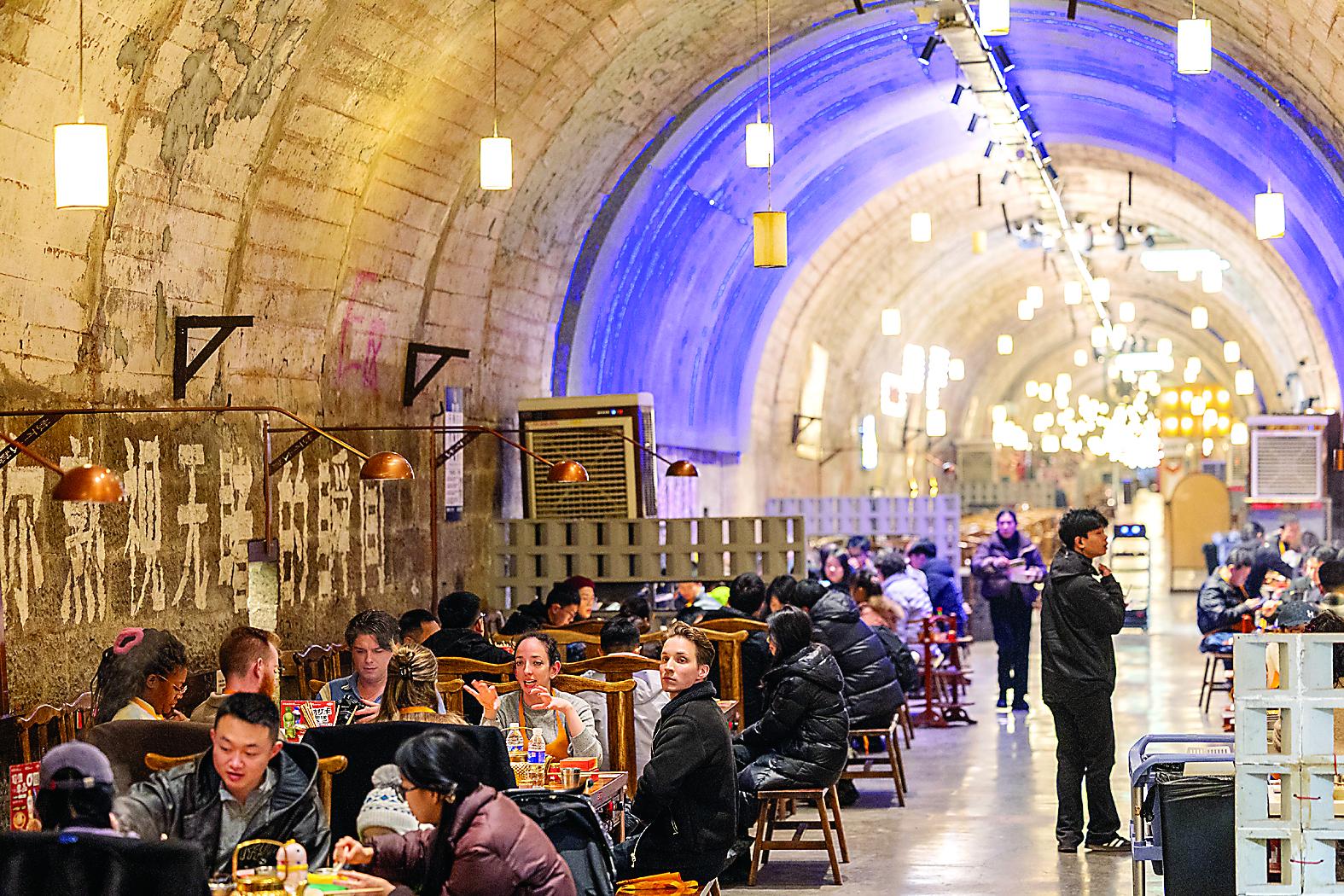 在重庆市两江新区,外籍人员在防空洞内品尝重庆火锅(1月24日摄)。