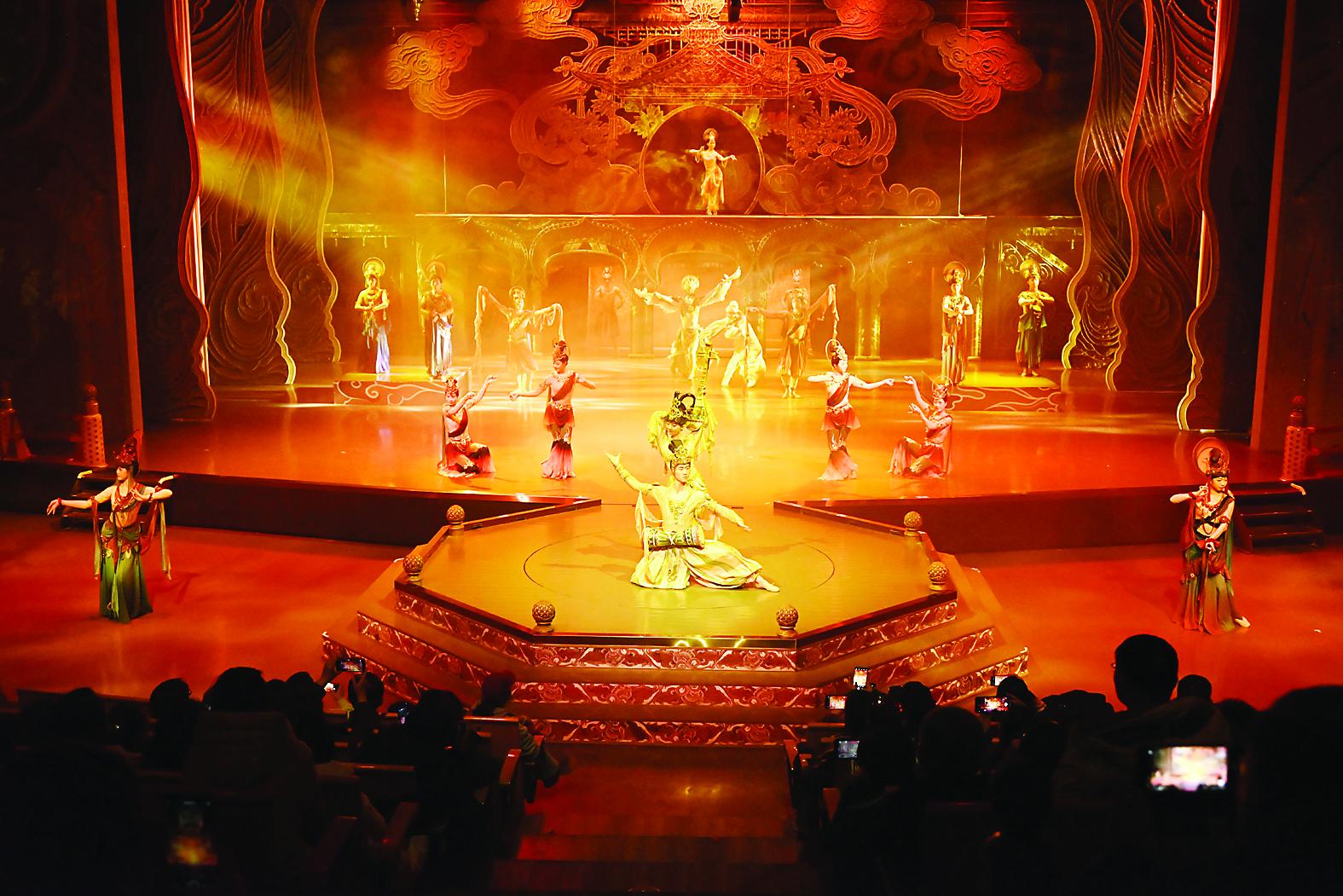 1月9日晚,游客观看大型洞窟沉浸式体验剧《乐动敦煌》。