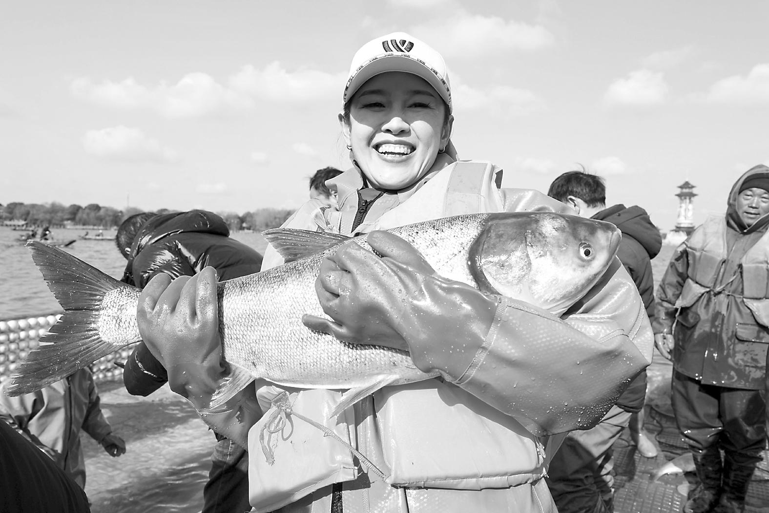 1月31日,在2026溱湖湾冬捕活动现场,市民展示自己参与捕鱼游戏捕获的大鱼。