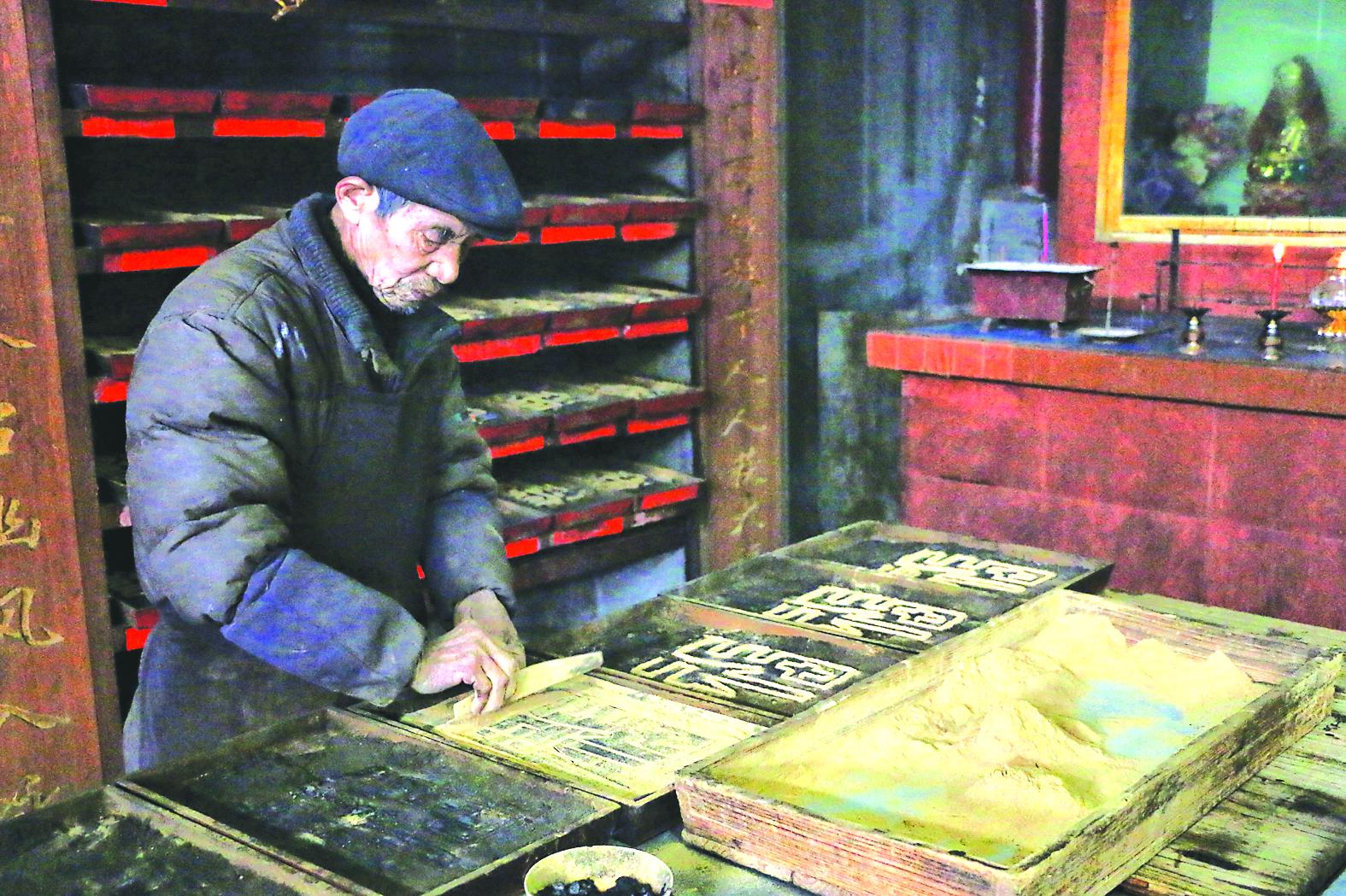 卫闽镇谢坊村村民在祈福文化馆内制作福字香盘(陈孟杰 摄)