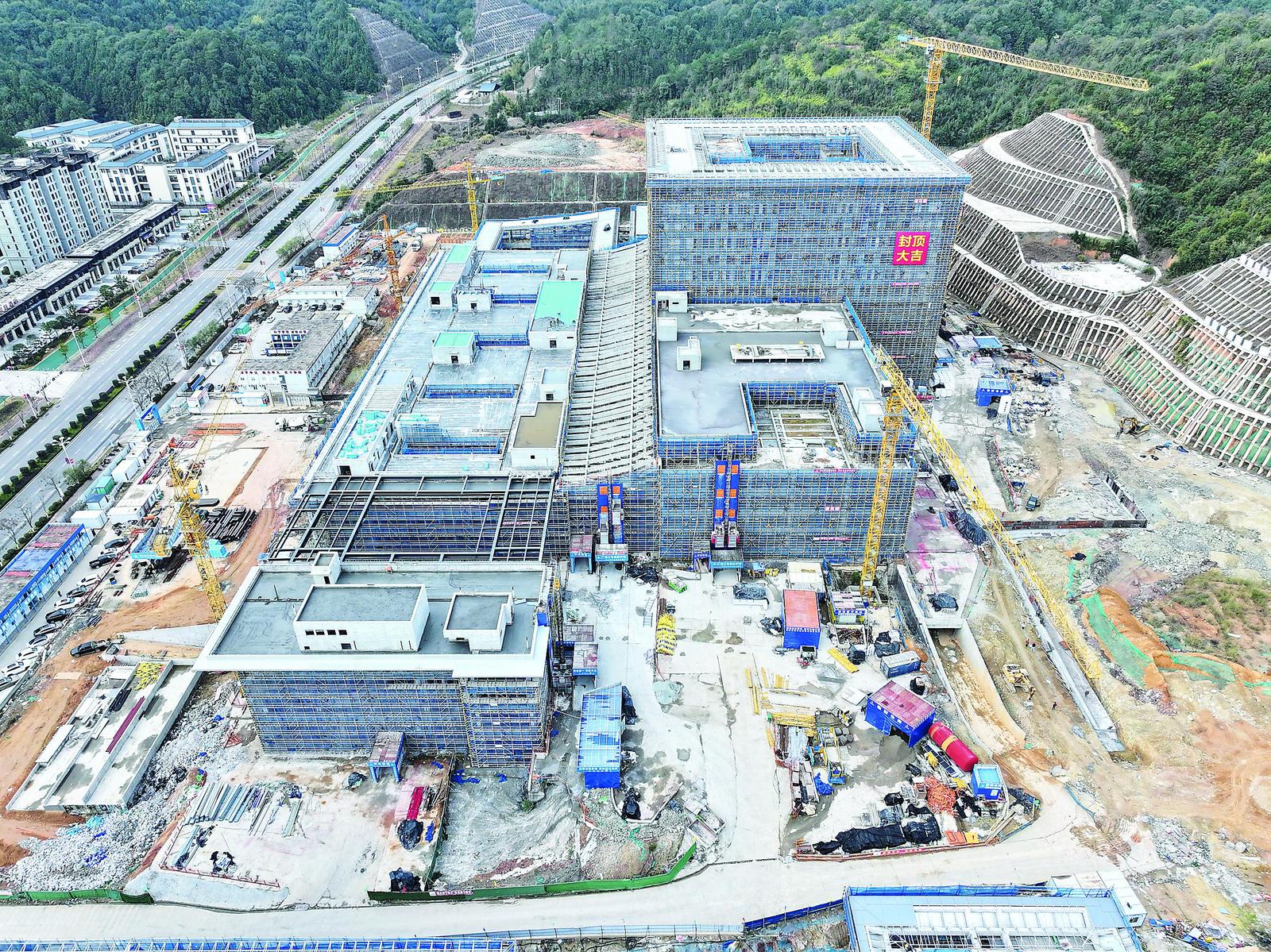 位于武夷新区南林核心区的武夷新区综合医院项目,是我市医疗领域投资规模最大的民生工程,总投资27.4亿元,分两期建设,设立总床位1200张。其中,一期规划床位600张,主要建设发热门诊楼、门诊楼、医技及一号住院楼、营养食堂、连廊、地下室、配电房、液氧站、污水处理站等。目前,一期主体结构已建设完成,进入内外部装修阶段,外立面工程进度已达20%。