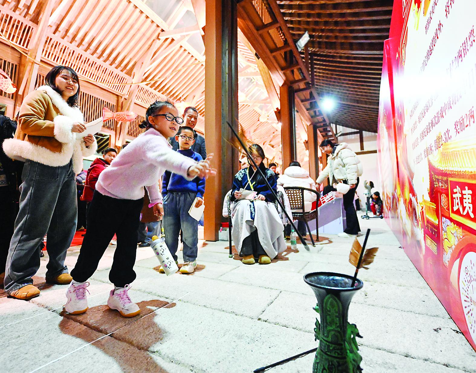 3日,“福马当先 福启新程” 南平市元宵喜乐游园会在武夷山水城龙昌桥举行。活动有非遗展演、趣味游园、廉洁文化特展,让南平的传统文化与 “福” 文化、廉洁文化在互动体验中得到传承与弘扬。图为市民和游客参加游园活动。 (张行健 摄)