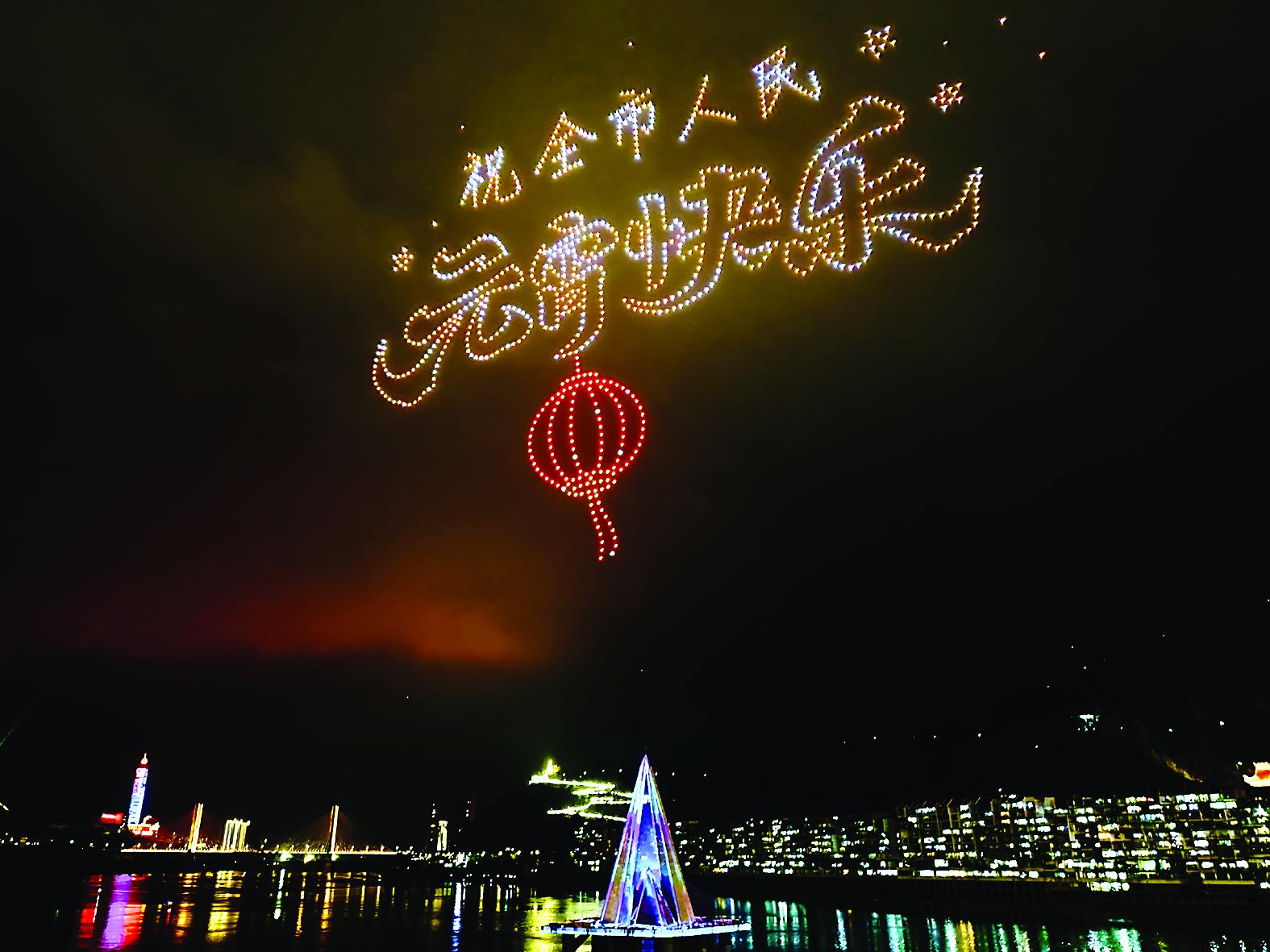 3日晚,延平区举行无人机烟花秀。千余架无人机盘旋空中,绘出新年祝福,双剑化龙标志处喷射出绚烂烟火,照亮了城市夜空,在元宵佳节之际为市民们献上了一场璀璨夺目的视觉盛宴。 (缪韵 摄)
