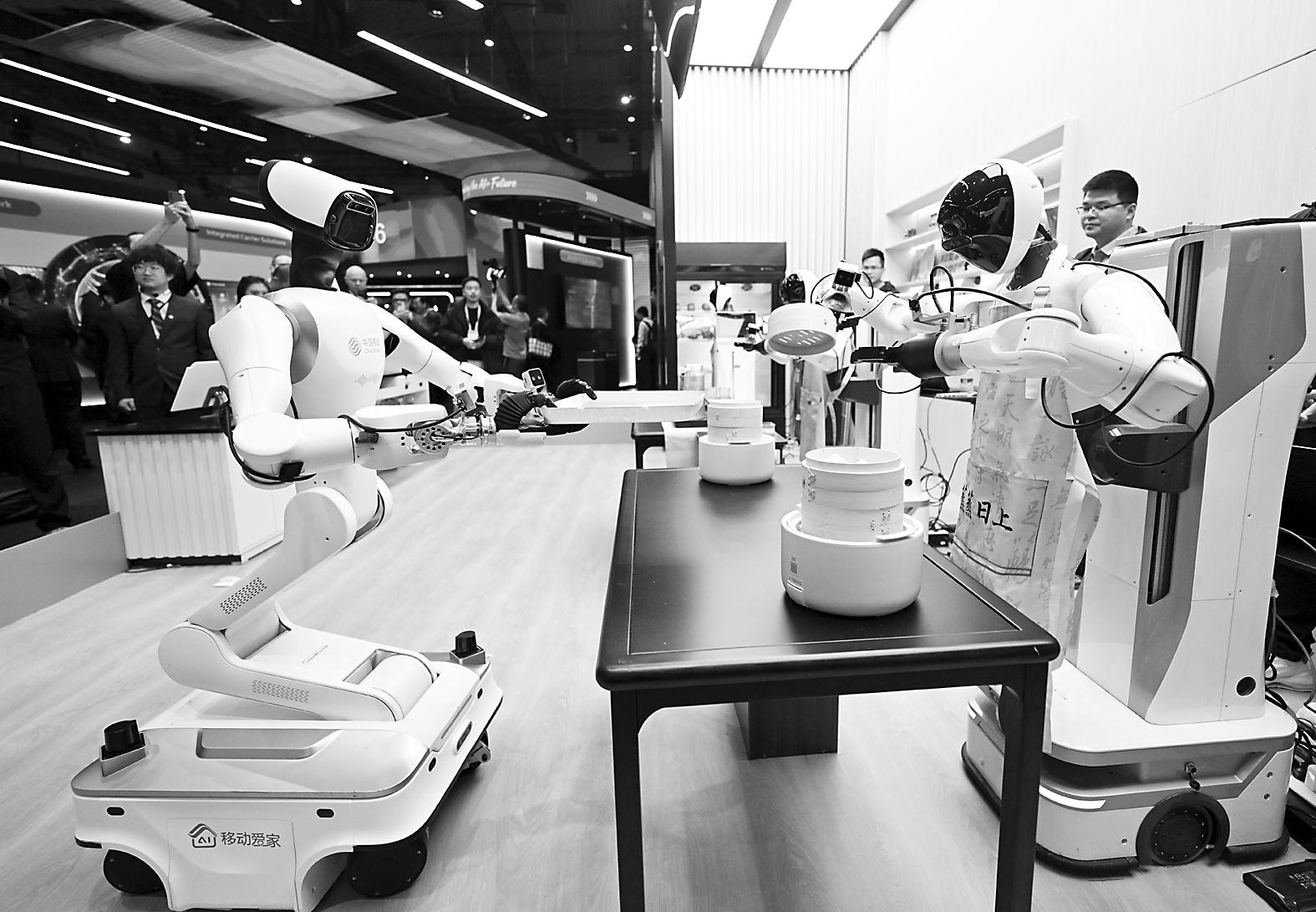 3月2日,在西班牙巴塞罗那,人们在中国移动展台参观厨房机器人。
