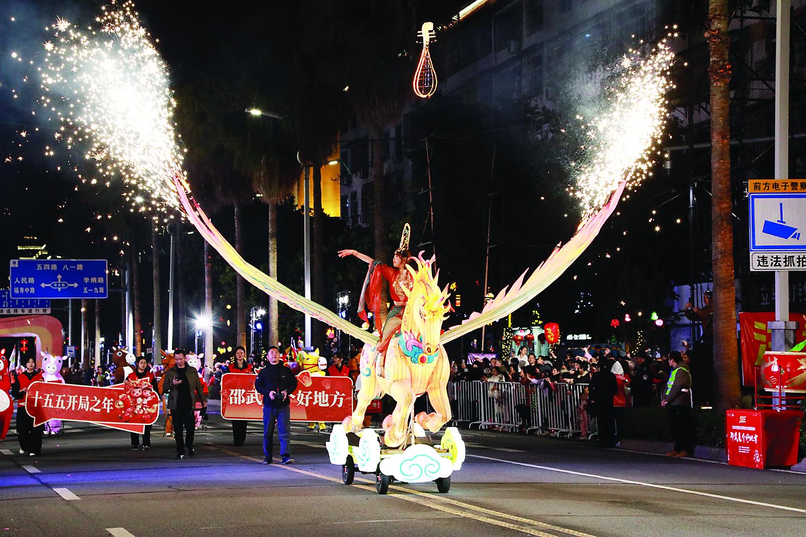 19时30分,福马造型亮相,“福马当先·福启新程·福耀邵武”全域沉浸式巡游启动。由29个方阵、800余人组成的队伍沿熙春中路向人民广场行进,鼓乐齐鸣、欢声阵阵,现场成为欢乐的海洋。