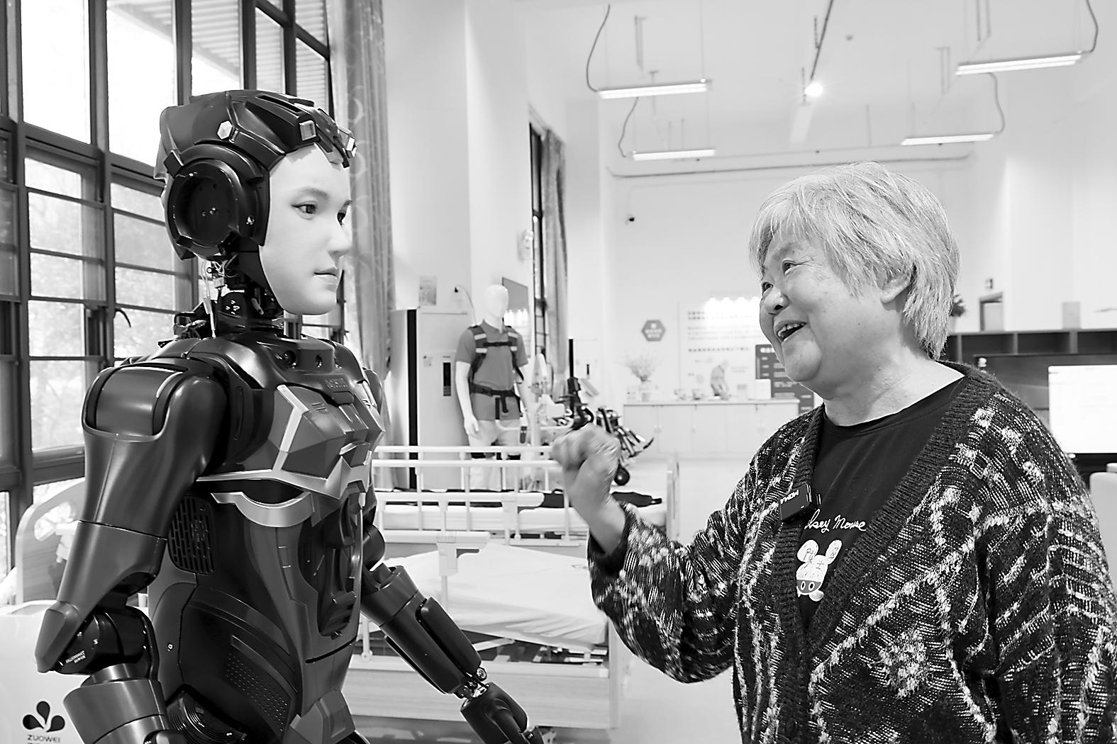2025年3月3日,在深圳市养老护理院,一名老人与人形机器人“夏澜”互动。