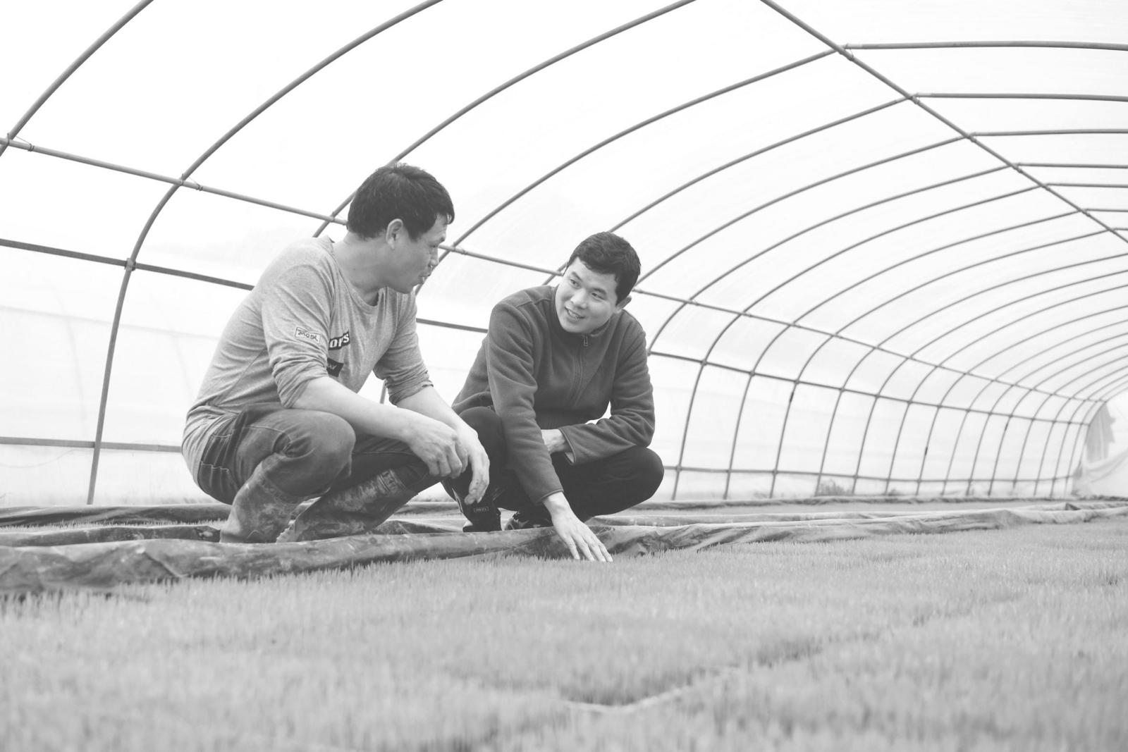 近日,政和县农业农村局高级农艺师张礼华(右)在石屯镇佐胜家庭农场的再生稻秧苗大棚内察看秧苗长势。政和县今年全县粮食种植面积12.14万亩,已进入春耕生产大面积推进阶段,政和县农业农村局组织农技专班主动到田间地头送技术、送服务,指导做好春耕备耕工作,为今年粮食丰产丰收筑牢根基。 (余长青 摄)