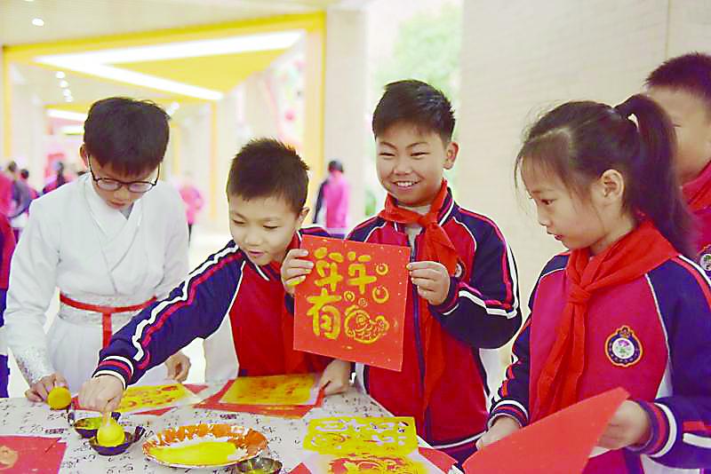 3月5日,南平实验小学武夷校区举行新学期开学典礼。学校结合马年生肖文化内涵,融合“和乐教育”育人目标,在校内打造了多个特色互动区域,让学生感受中华优秀传统文化魅力,收获新春美好祝福。图为同学们在体验传统拓印技艺。