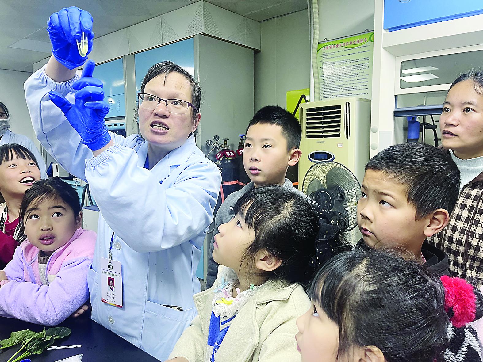 近日,闽北日报社“南平发布”App与南平市食品药品检验检测中心联合开展“小小食药安全检测员”科普实践活动。31名中小学生走进检测中心,在专业人员指导下参与中药材真伪识别、饮品酸碱度检测、果蔬农药残留快检等趣味实验,学习食药安全知识。图为南平市食药检测中心高级工程师黄凤妹向孩子们讲解如何快速筛查展示菠菜中有机磷农药残留。 (张伟 摄)
