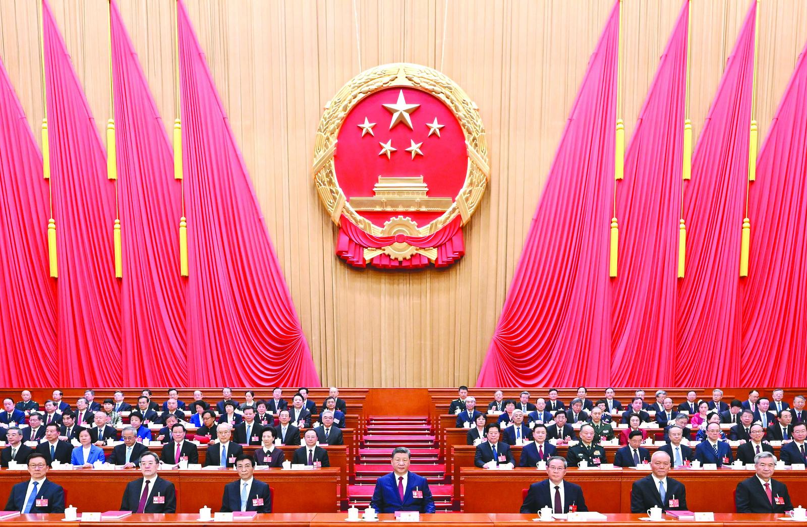 党和国家领导人习近平、李强、王沪宁、蔡奇、丁薛祥、李希、韩正等在主席台就座。 (新华社记者 谢环驰 摄)