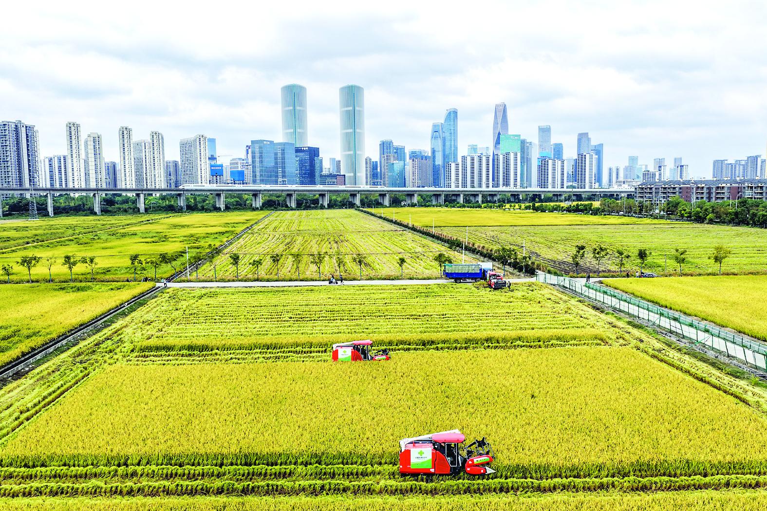 2025年10月21日,在浙江杭州萧山区,收割机在稻田里收割水稻,远处高铁列车飞驰而过(无人机照片)。