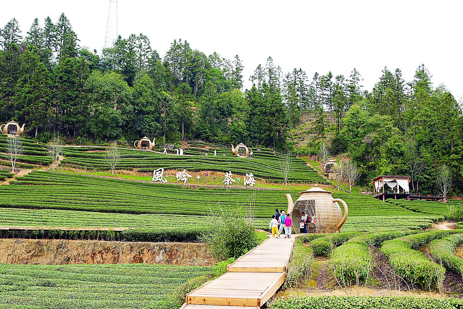 近日, 位于武夷山星村镇滨水茶足径的新晋打卡点“风吟茶海”,成为游客周末踏青品茗的热门选择。几座形似大茶壶的茶室错落点缀于茶山之间,成为游客歇脚品茗的惬意去处。 (林李冰 摄)