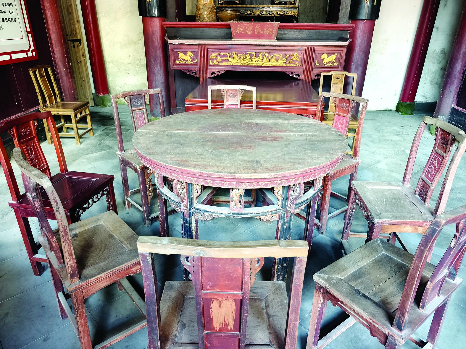 厅堂内的半圆拼合圆桌,是古人生活智慧的体现。应积满介绍,因古时难寻大型整木,匠人以拼接工艺解决用料难题,兼顾搬运收纳。桌面下的镂空木雕将“八仙过海”凝于方寸,人物神态生动,虽金漆渐淡,仍可见当年流光溢彩,兼具实用与审美价值。