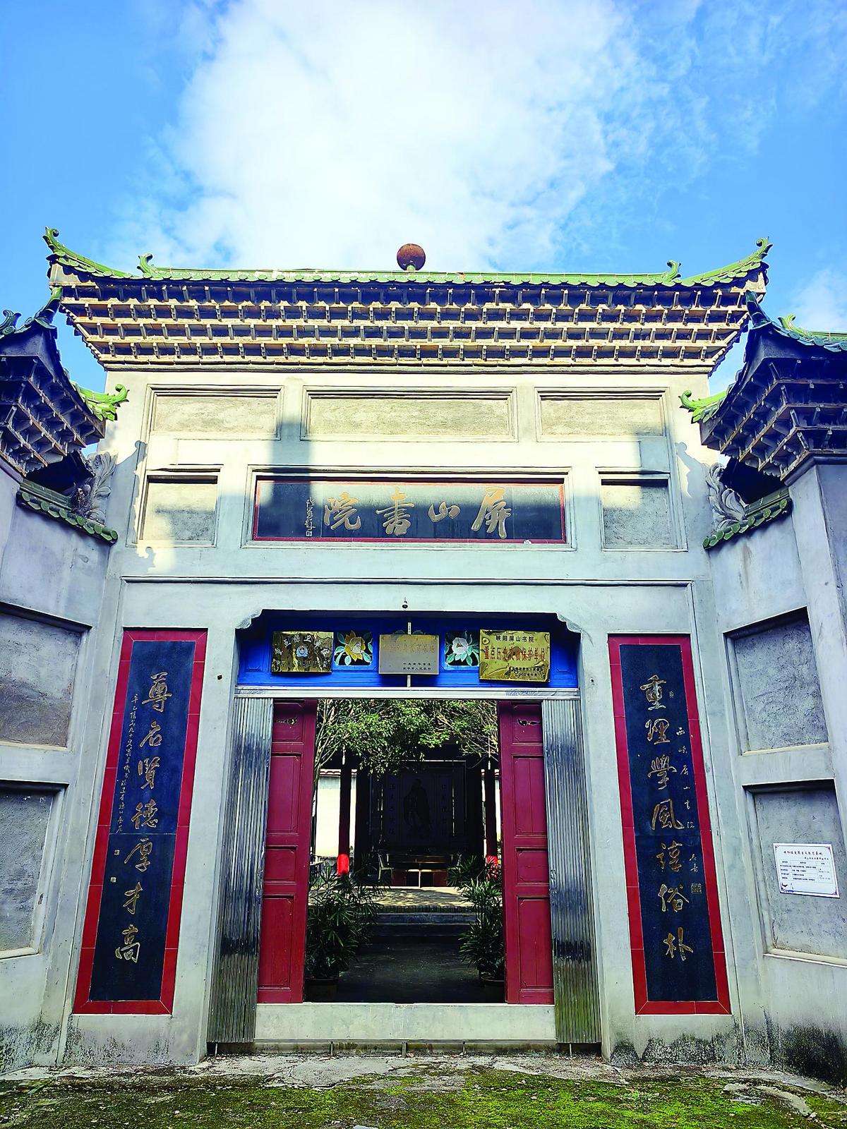 离开百忍堂,沿古镇街巷前行,便到了玉屏山下的屏山书院。书院因背靠玉屏山得名,始建于清道光二十八年(1848),距今170余年历史,是集朱子文化遗存、红色苏区旧址、青少年爱国主义教育基地于一体的文化地标,更是峡阳的“文化摇篮”。