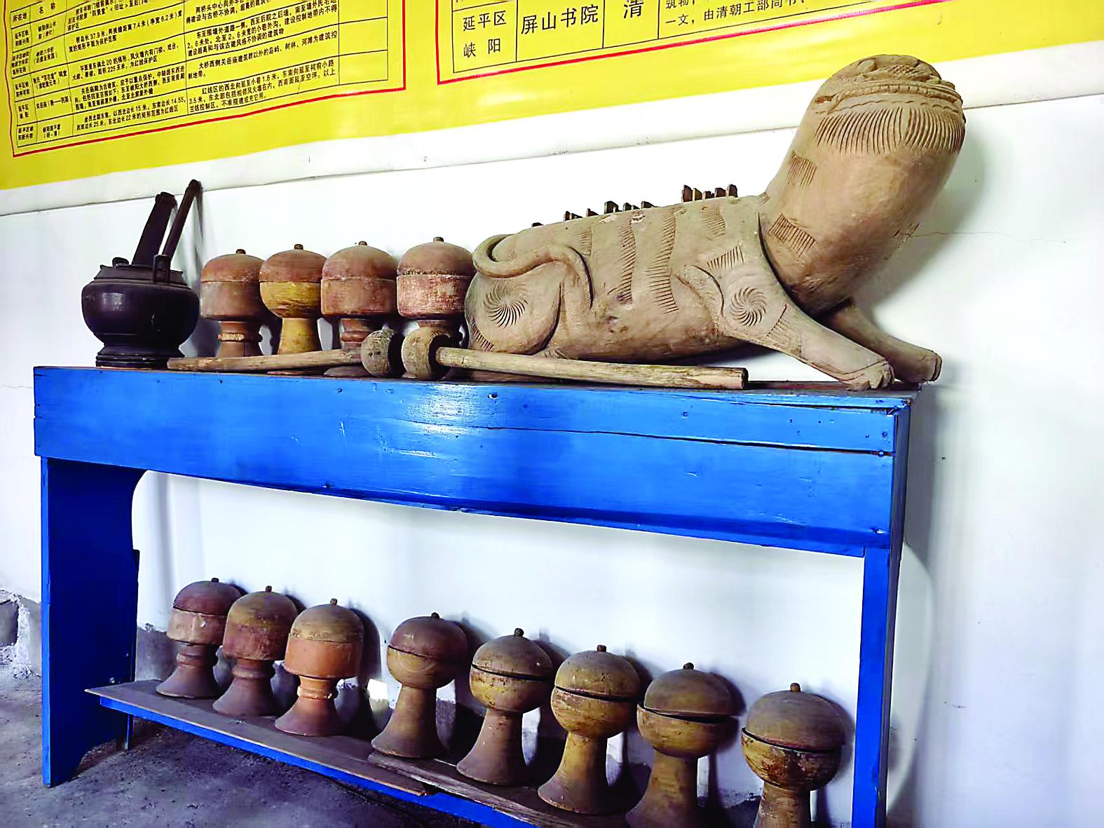 陈列馆内,几件木制文物诉说着书院风华。据说这是2000年书院修缮工程中,工作人员意外发现的。