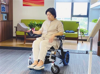 | 王梅体验电动轮椅。 |