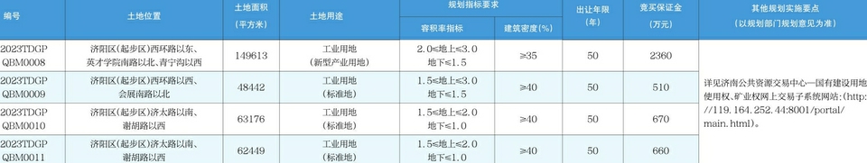 经济南市人民政府批准,济南公共资源交易中心与济南新旧动能转换起步区管理委员会建设管理部联合发布国有建设用地使用权挂牌出让公告,现将有关事项公告如下: 一、地块基本情况和规划指标要求 本次出让国有建设用地使用权共计4宗,具体详见附表。 二、中华人民共和国境内外的法人和其他组织均可申请参加(自然人、欠缴土地出让金、闲置土地、囤地炒地、履行土地使用权出让合同存在严重违约行为的单位和在本市土地招标拍卖挂牌出让中有违规行为的单位及关联单位,以及法律、法规另有规定的除外)。 三、本次国有建设用地使用权采取网上挂牌方式出让,按照价高者得原则确定竞得人。 四、申请人可于2023年8月10日起登录济南公共资源交易中心—国有建设用地使用权、矿业权网上交易子系统(http://119.164.252.44:8001/ portal/main.html,以下简称“网上交易子系统”)下载网上挂牌出让公告、网上挂牌出让须知及其他相关网上挂牌出让文件,并按上述文件规定的操作程序在网上参加竞买。 五、申请人可于2023年8月30日至2023年9月7日16时前登录网上交易系统,提交竞买申请书并按要求足额缴纳竞买保证金。竞买保证金到账的截止时间为:2023年9月7日16时。 因银行保证金系统到账存在时间差,建议竞买申请人竞买保证金缴款时间适当提前。 六、本次国有建设用地使用权网上挂牌时间为2023年8月30日9时至2023年9月11日9时30分。 七、资格审查 本次国有建设用地使用权网上挂牌出让实行竞买资格后置审查制度。竞得人应当在网上交易结束后按照挂牌出让文件约定时间,持成交通知书、竞买申请书、国有建设用地使用权报名表、授权委托书、营业执照副本、法定代表人身份证明书、法定代表人身份证及复印件,或代理人身份证和复印件(以《挂牌出让须知》为准)到济南新旧动能转换起步区管理委员会建设管理部进行资格审核。审核通过后,签订书面《成交确认书》并报济南公共资源交易中心备案;审核不通过的,竞价结果无效,该宗国有建设用地使用权重新挂牌出让。竞买保证金按照《济南市国有建设用地使用权网上挂牌出让规则(试行)》的规定办理。 八、其他需要公告的事项 (一)申请人必须携带相关有效证件资料到济南市公共资源交易中心申请办理数字证书,方可登录网上交易系统申请并参与竞买。数字证书的办理程序和申请资料要求详见网上交易系统《使用帮助》。 (二)竞买申请人应详尽了解本次网上挂牌出让地块现状及所列条件,提交竞买申请视同对本次网上挂牌出让地块的现状及所列条件无异议并全面接受。 (三)本次国有建设用地使用权网上挂牌出让只接受网上竞买申请(即通过网上交易系统进行),不接受书面、电话、邮寄、电子邮件及口头竞买申请。 (四)竞买保证金缴纳银行账号是由网上交易系统随机自动生成唯一的竞买保证金子账号。 (五)土地相关权利人自本公告之日起,认为该出让行为侵犯其合法权益的,可依法提起复议或诉讼。(六)未涉及事项,以挂牌文件为准。联系方式:■济南新旧动能转换起步区管理委员会建设管理部 联系地址:济南新旧动能转换起步区 南边界路市民中心7楼 联系电话:0531-66604052联 系 人:刘钊■济南公共资源交易中心CFCA证书办理联系地址:济南市历下区文化西路13号 海辰大厦B座1009 联系电话:400-0531-556 0531-67880028 邮箱地址:cfcajnggzy@163.com山东CA证书办理联系地址:济南市历下区趵突泉北路24号 山东省数字证书客户服务中心 联系电话:4006078966 济南公共资源交易中心济南新旧动能转换起步区管理委员会建设管理部2023年8月10日
