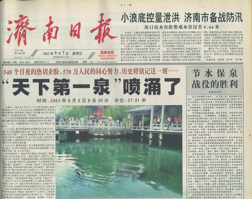 2003年9月7日,本报报道趵突泉复涌。 2003年9月6日上午8: 30,在现场无数双眼睛的期待中,趵突泉恢复喷涌。这是济南市委、市政府实施保泉战略,带领全市人民团结一心、共同奋斗所取得的伟大成果。泉城市民将永远记住那一时刻。到今年9月6日,趵突泉已持续喷涌达20年。 济南素有“泉城”之称,仅老城区内就有泉水200余处。“七十二名泉”中,尤以趵突泉最负盛名。纯洁、活泼、鲜明……在老舍先生的散文中,他用这3个词语描绘趵突泉,别有一番风味。趵突泉以其涌水量大、气势壮观位列群泉之首。历史记录趵突泉的最大涌水量达每日16.2万立方米,“3股大泉,从池底冒出,翻上水面有2-3尺高”,“云雾润蒸华不注,波涛声震大明湖”,气势蔚为壮观,素有“天下第一泉”的美誉。 然而,自20世纪70年代以来,趵突泉出现了断流停喷,每年断流停喷的时间少则两三个月,多则半年、一年。而从1999年3月至2001年9月泉水断流停喷时间长达926天,是有记载以来最长的一次。趵突泉泉池底时常一片绿草,孩子们可以在泉池底部踢球娱乐。 “9月6日早8点半,我永远记得那一时刻。”李世欣自1997年9月至2005年9月,在市名泉保护管理办公室工作,亲历了趵突泉复涌激动人心的那一刻。 李世欣回忆,2003年9月初,几场蒙蒙细雨洒落泉城,市区地下水位回升到26.70米。起初,五龙潭、珍珠泉开始涌出了汩汩泉水,而趵突泉却依然沉睡未醒,离泉水喷涌的地下水位标高27米,还差0.3米。“这0.3米的水位线,牵动着市领导和广大泉城市民的心,我几乎天天蹲守泉边,9月5日那晚更是彻夜不眠守候。”李世欣说,在那段时间里,全市先后两次召集水利、保泉、气象、公用、园林、环保等部门的负责同志,专题研究泉水复涌,并提出封闭自备井、停止西郊抽水试验等10项具体措施。 9月6日,市区的地下水位上升到27.01米。趵突泉边,无数自发聚集到那里的市民翘首相望,企盼激动人心时刻的到来。趵突泉3个井口先是汩汩向外涌水。8时20分,公园的管理人员跳进泉池,潜入水中,拧开了3个泉眼井盖上的螺丝,小心翼翼地打开井盖,霎时间,伴随着一串串翻滚的水泡,3个泉眼涌出了清澈的泉水,在周围荡起一圈圈涟漪(见压题资料照片)。 “喷了!趵突泉喷了!”李世欣告诉记者,那一刻,现场一片欢腾,人们欢呼雀跃,眼睛里都滚动着喜庆的泪花。泉涌人欢,人们奔走相告,如欢庆节日般庆贺泉水的复涌。 泉水,只有泉水,才能在泉城人的心目中具有如此巨大的凝聚力和感召力。济南市顺民心、合民意,采取了一系列重大保泉举措。全市各有关部门积极配合,实施了“封井、引水、增雨、补源、节水”等具体措施,千千万万的泉城人,都在为保泉献上一份力量,为泉水复涌打下了基础、创造了条件。9月6日是每个济南市民的“光荣日”,也是济南人自觉爱泉护泉的最好见证。在各种强力保泉措施的保障下,趵突泉持续喷涌20年,再也没有停喷过。 如今,“家家泉水”不再是济南怅然若失的回忆,“泉城”已然成为深入人心的“地标式”画像。今年,济南降水充沛,地下水位不断攀升,“趵突腾空”“水涌若轮”“黑虎啸月”“月牙飞瀑”……济南“千泉竞喷”的美景令海内外游客流连忘返。今年“五一”小长假,济南泉水游频登热榜,诸多泉水胜景引得游客纷至沓来,趵突泉景区门口更是清晨排起百米长队。这既是接连不断的降雨有效补给地下水位的结果,也得益于市委、市政府的保泉决策,得益于各级各部门、社会各界、泉城市民的共同努力。 “泉生济南、泉兴济南”。趵突泉等群泉的持续喷涌,给泉城济南带来了勃勃生机和活力,让“天下泉城”更加亮丽,更具魅力。(本报记者刘烨)