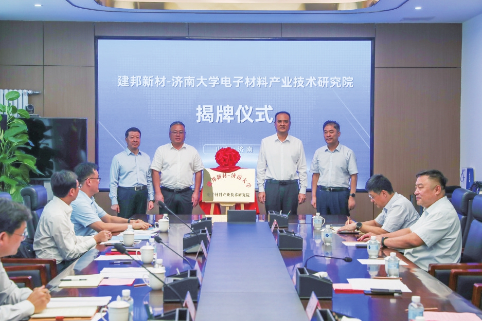 建邦新材-济南大学电子材料产业技术研究院揭牌成立。 本报9月27日讯(记者 张素芬 通讯员 高文超李福英)今天上午,建邦新材-济南大学电子材料产业技术研究院在济南新材料产业园区揭牌成立。 仪式上,与会领导为济南大学先进高分子材料产业学院相关人员发放聘任证书,随后举行了建邦新材-济南大学电子材料产业技术研究院揭牌仪式、济南大学人才培养“建邦班”启动仪式。 作为天桥区工业经济发展的主阵地、新型智造组团的重要承载地,一直以来,济南新材料产业园区大力实施创新驱动发展战略,持续推进创新平台载体建设,不断加大科技创新主体培育力度,新型功能材料、智能制造装备两大主导产业加速发展,其中一批关键技术及品牌已达到国际国内领先水平。 为提升核心竞争力,近年来,济南新材料产业园区与济南大学持续开展深度合作,携手打造“人才+产业+学科”协同发展平台,共建国家级大学科技园济南大学科技园。目前,济南大学科技园已成功孵化润涵新材料、大湖新材料、东鼎电气、智宣光电等一批优质项目,园区也成为济南大学重要的科技成果转化基地、实习实践基地和创业就业基地。 作为园区龙头企业,山东建邦胶体材料有限公司专注深耕材料技术研究和试验发展10余年,打造了中国第一条特有工艺、完全自主知识产权的电子级超细银粉生产线,作为中国北方唯一的高端银粉生产企业,已成为园区工业经济发展的顶梁柱,为天桥区经济发展作出了重要贡献。 此次济南大学与山东建邦胶体材料有限公司强强联合,成立建邦新材-济南大学电子材料产业技术研究院,有助于进一步优化园区产业结构,加速产业集聚和升级,加快园区产学研一体化赋能高质量发展的步伐。 下一步,该产业技术研究院将紧密依托济南大学的科技、人才、学科优势和建邦胶体的研发、产品、市场优势,推进技术开发、课题攻关、咨询服务、技术服务深度融合,释放更多发展强劲动能,为区域经济发展蓄势赋能,打造新时代产教融合、校地合作示范标杆,谱写区域高质量发展新篇章。