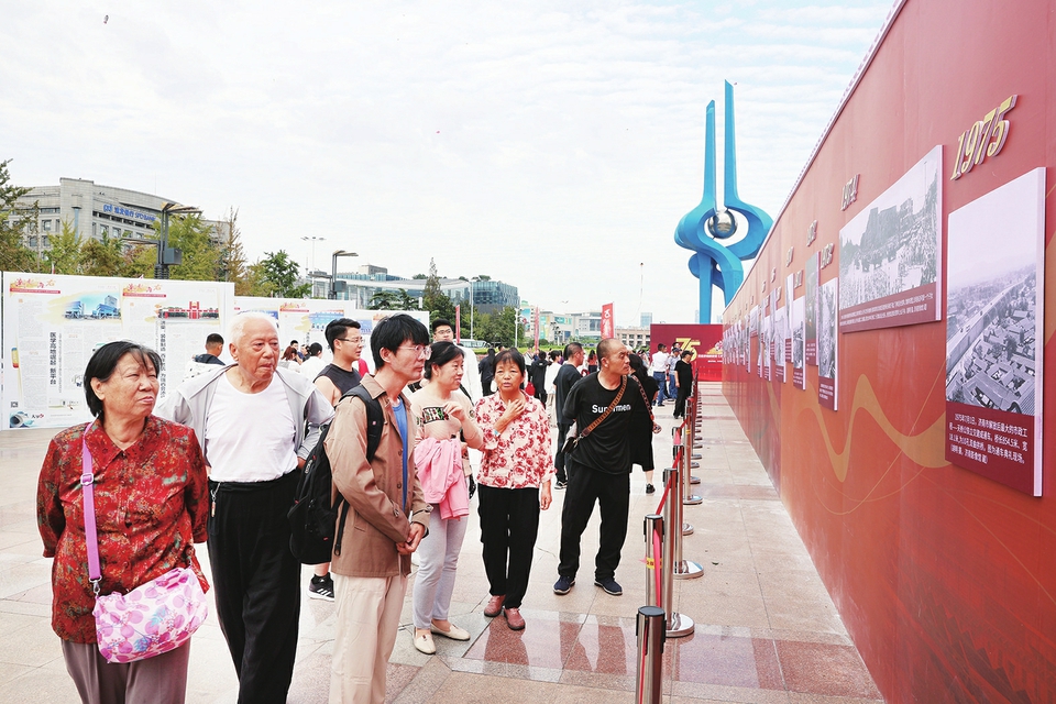 10月2日,市民游客在泉城广场参观展览。(本报记者吕传泉摄)  本报10月2日讯(记者 冯瑜)今年的国庆假期,济南又多了一处意义非凡的打卡地——10月1日至3日,在泉城广场举办的“潮起海右——纪念济南解放暨《济南日报》创刊75周年图片展·巨报展”。  展览由中共济南市委宣传部指导,济南日报报业集团主办。图片展由济南日报影像资料工作室精心挑选的70余张照片组成,用75年里的70余个瞬间勾勒出济南发展的脉络和轨迹、成就与辉煌。巨报展则以济南日报推出的“潮起海右——纪念济南解放暨《济南日报》创刊75周年特别报道”为主要内容,分为城市跃升、经济腾飞、民生日新、与城共进4个篇章,共计80余个整版报道。  10月2日,展览第2天,观展人群依旧络绎不绝。展览吸引了给孩子上历史课的家长,重温青春岁月的老人,以及来济南观光的外地游客。一堂生动的“历史课”  “儿子,快过来,你不是喜欢历史吗?”10月2日下午,一位父亲高声呼喊身后的孩子凑近看图片展。  等孩子跑上前,这位父亲就拉着他从1948年济南战役胜利的一张照片看起,并绘声绘色地讲解——  “这是济南解放后,解放军战士在城墙上吹响胜利的号角。”  “‘寿光地方武装活捉王耀武’,这是1948年10月1日,《新民主报》当时刊登的一篇新闻标题。”  ……  带着孩子从第一幅图片讲起,父子俩70余张照片一个不落地看完。这位父亲姓王,住在历城区,想带着孩子去泉城路逛一逛,走到泉城广场时发现了这个展览。“真是意外之喜,这些照片从别的地方很难看到,没想到这次全都集齐了。今天,我带着孩子看完这些图片,就仿佛带着他穿越了济南75年的时光隧道,我们俩都受益匪浅。”  展览现场,和王先生类似的家长还有不少。孩子不识字,家长们会逐字逐句念给孩子听;孩子认识字,家长们会和孩子边看边聊当年的历史。一处人气爆棚的打卡点  30余张黑白照片、30余张彩色照片,讲述了济南75年的发展脉络。图片展人气爆棚的同时,两侧的巨报展同样吸引了不少人驻足端详。  巨报展由80余个报纸版面组成,每个报纸版面放大近50倍,制作成2米×3米的巨报,气势恢宏,制作精美、创意十足、内容厚重。印有红色数字“75”的封面设计、“昨天与今天”的整版图片、济南加快建设“强新优富美高”新时代社会主义现代化强省会的相关报道……这些报纸版面纷纷成为市民游客的驻足点和打卡点。  刘倩是一名设计从业者,她特意带着相机前来逐一拍照琢磨。“70余张照片唯美震撼,80多个报纸版面精彩纷呈,对我来说,这可是不可多得的设计类教材。你看,这些照片、版面和文字都是你们这些专业媒体大咖拍摄和制作的,我可得抓住这次学习的好机会。”刘倩兴奋地说。一部记录“你我”的奋进史  “小鸭小鸭顶呱呱……”念到图片展上这句很多济南人耳熟能详的广告语时,观展的众人不免相视一笑。  “从单缸洗衣机到双缸洗衣机,一个缸负责洗,一个缸负责甩干,到现在又变成了一个缸的滚筒洗衣机,科技在进步,创新永不停。”现场观看展览的一位父亲对女儿循循善诱。  展览用图片和文字详尽展现了济南的重大发展轨迹:第一条公路、第一座立交桥、第一条轨道交通、第一座大型商场、第一个制造业品牌……现场观展的人无不陷入回忆与感慨。  “这是我出生那一年发生的事儿,1956年。”一位老人告诉身边的子女。  “这是我和你一样大的时候发生的事情。”一位母亲告诉身旁的儿子。  “这是我们曾经工作的单位。”两位老人思绪飘远。  “这是对我们单位的报道。”两名年轻人不无自豪。  展览将现场所有参观者带回过往激情燃烧的岁月、带进踔厉奋发的新时代。一个与时代同频共振的展览  10月3日,“潮起海右——纪念济南解放暨《济南日报》创刊75周年图片展·巨报展”将迎来最后一天。为弥补许多人不能亲临观展的遗憾,济南日报特意制作了“潮起海右——纪念济南解放暨《济南日报》创刊75周年图片展·巨报展”VR,已经在“济南发布”客户端同步上线。  VR采用虚拟现实技术,突破时空局限,将展览制成影像资料,实现了实景参观的网络再现,使之成为一个永不落幕的网上展览。看过展览的观众也可重温精彩内容,获得沉浸式、漫游式情境体验,重温济南解放以来75年间发生的翻天覆地变化和各项事业取得的巨大成就,品味感受济南“山泉湖河城”的秀美风光和全市人民团结拼搏、昂扬奋进的风采。  此外,图片展中70余张珍贵图片,也已通过微刊形式在“济南发布”客户端同步发布。  让我们线下线上跟着一张张有故事的老照片和一篇篇厚重的新闻报道,循着历史的脉络,穿越75年时光隧道,重温那些激动人心的时刻,向济南75年的壮阔征程致敬。