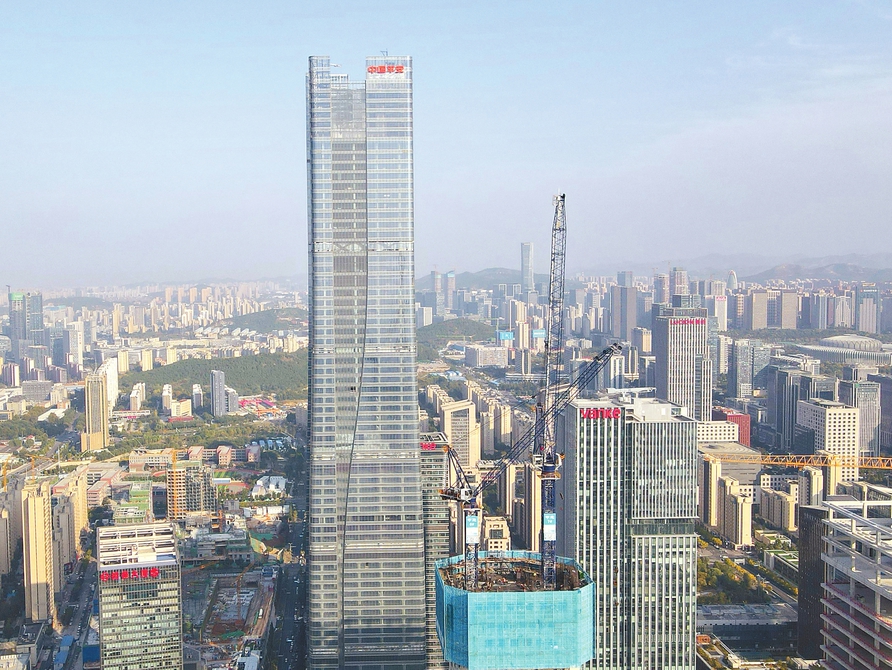 10月23日,济南中央商务区的平安金融中心项目玻璃幕墙安装和楼体亮化调试已完成,室内一至五区机电施工收尾,精装修施工完成接近90%,目前进入招商阶段。该项目计划年底前建成交付。据了解,平安金融中心项目位于济南中央商务区核心区域,建筑总高度360米,共62层,是集5A甲级办公楼、五星级酒店、商业购物中心于一体的城市综合体,是济南CBD五座超高层建筑中的第二高,代表“山、泉、湖、河、城”中“河”的元素。 (本报记者崔健摄)