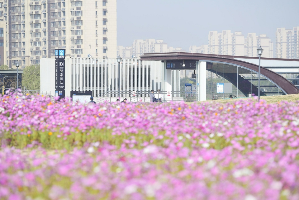 10月25日,市民在济南轨道交通3号线裴家营站乘车。当日,裴家营站开通运营,不少市民赶来“尝鲜”,车站外的百日菊和格桑花花海也迎来了大批的赏花游客。3号线裴家营站位于济南东站片区响泉街中段,为地下两层岛式车站,车站开通运营后,极大方便了周边市民群众的日常出行。车站设有3个出入口,本次启用A、B两个出入口。A口位于龙脊河西路与响泉街交叉口以东路南。B口位于龙脊河东路与陈家路交叉口以北250米路西。裴家营站以现代、商务风格为空间主题,线条简洁、配色大胆,彰显了济南的青春与活力。站内共设有5组艺术品,各空间总体构造以平立面结合为主,以对称式布局坐落于站厅、站台通道两侧,选取“衣、食、住、行、游、购、娱”等贴近大众生活的主题作为设计方向。 (本报记者崔健摄)