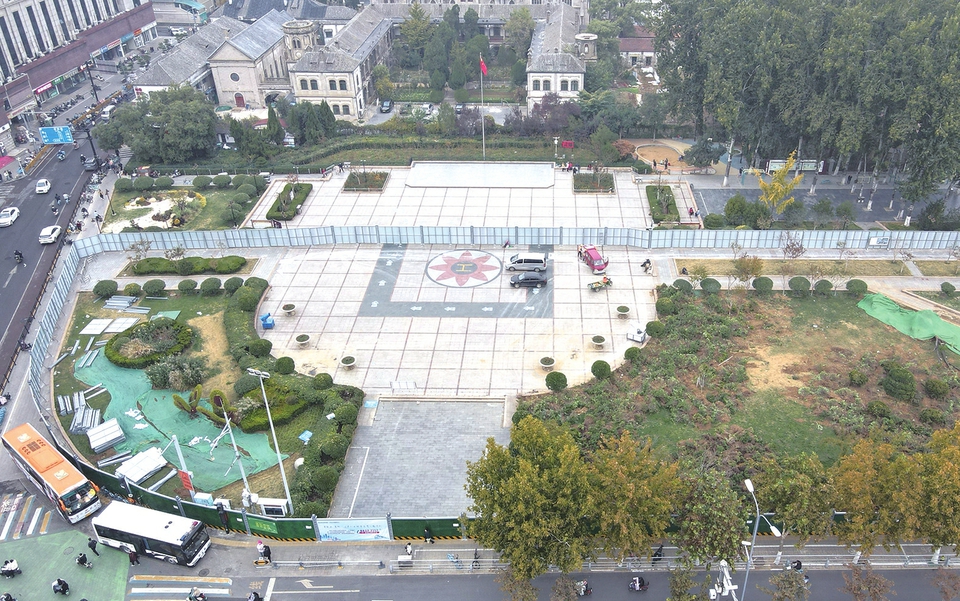 11月15日,济南市洪楼广场南侧和东侧区域施工围挡安装就位,封闭区域约占广场总面积的一半。围挡区域内,施工人员已开始对绿植进行迁移,并拆除广场地砖,为下一步的轨道交通建设作准备。 据了解,按照济南市轨道交通整体施工部署,自2023年11月6日起对轨道交通7号线一期工程洪楼广场站(工程名)进行围挡施工,本次施工时间自2023年11月6日起至2024年5月10日,分两期实施广场内绿迁、花园路南侧导改路施工。洪楼广场站为地下二层岛式车站,位于洪家楼北路与花园路交叉口东北侧,沿花园路东西向布置,车站长度为174.8米。 目前,轨道交通7号线全线3座车站进行主体结构施工,2座车站基坑开挖,4座车站进行围护结构施工,7座车站局部围挡进行绿迁、管迁等市政前期施工。(本报记者崔健摄)