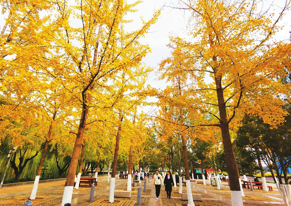 11月15日,济南泉城广场泉标西侧的银杏林渐渐披上“金装”,在初冬时节为市民呈现浪漫的景致。 据了解,由于今年秋季气温偏高,泉城广场银杏林较往年泛黄的时间推迟,原本应在深秋季节迎来最佳观赏期的银杏林,在初冬时节才逐渐披上金装,较往年推迟了近半个月。 (本报记者崔健摄)