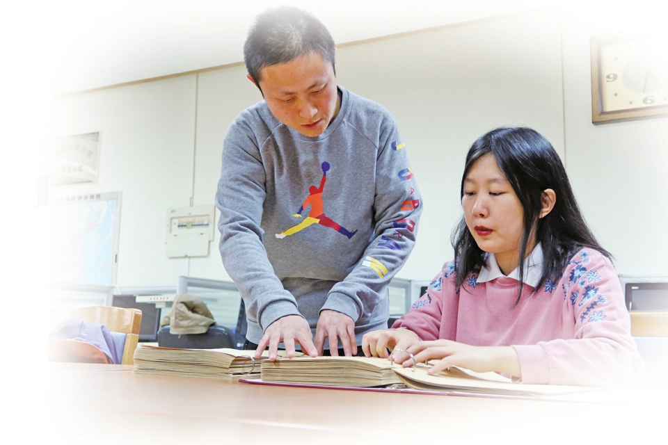 石亚瑄(右)和李鑫(左)校对文稿。 石亚瑄需要触摸检查每一行文字,确保打印装订无误。 下午5时许,穿上羽绒服外套,手持盲杖,石亚瑄缓缓走出无障碍阅览室的大门。目前,石亚瑄还是一名大三法律系学生,每周她都会抽出两天,来这间阅览室做志愿服务。刚刚,她连续工作8个小时,为一位视障学生打印了一本多达700页的学习资料。 12月6日上午,在山东省图书馆的无障碍阅览室里,一位年轻姑娘正在整理书架上的书籍。她留着披肩长发,干净清爽的面庞、休闲整洁的衣裳,看上去与其他女孩无异。但仔细观察你会发现,她的眼神有些低垂,手里的工作更多是靠摸索。 她叫石亚瑄,是这间阅览室的志愿者。 如果不是几年前的一场意外导致失明,石亚瑄应该已经在自己喜爱的轮机专业毕业,从事机甲维修的工作。月有阴晴圆缺,人有顺境逆境。职业梦想破灭,人生道路改写,但她并没有因此而消沉——被命运打碎的“航海梦” “我打小就有个航海梦。”高考后,如愿考上山东交通学院轮机专业的石亚瑄,曾对自己今后的职业有着美好的憧憬。“在轮船上工作,‘带薪环游世界’,想想都觉得很棒!” 谁能想到,一场突如其来的疾病,将女孩的“航海梦”打碎了。曾经的她,在老师和同学们眼中,是一个热爱学习、多才多艺的女孩。可大二那年,石亚瑄忽然发现视力下降,就医后被诊断为因颅底骨纤维异常增殖,压迫到了视神经,她只能中途休学接受治疗。 两年间,石亚瑄先后做过6次手术,但视力依然不断下降。“有段时间,每天早上一醒来,都会发现比前一天还要黑。那应该是我心态最崩溃的时候。”和许多中途失明的视障者一样,石亚瑄也经历过一段与世界隔离的日子。 在这个家庭中,“看”曾经是禁忌词。“我虽然看不见了,但是却能感觉到家人的那份小心翼翼。说实话,在失明之前,我从未留意过家人尤其是妈妈对我的付出……”说到妈妈,石亚瑄声音有些颤抖,回忆起母女两人半夜坐火车去北京就医,为了省钱在火车站过夜的经历,这个坚强的姑娘眼睛里闪着泪光。这里的设备不再蒙灰 母爱是港湾,也是动力。重新振作起来,是对妈妈最好的报答。为了能尽快返回课堂,石亚瑄开始学习盲文。石亚瑄具备很强的学习能力,也擅长通过网络来查找学习资源。她仅用一周就学会了盲文,又在很短的时间内掌握了基础的语音转换软件。 也就是在那段重拾学习的时间里,石亚瑄与这间无障碍阅览室结缘,认识了阅览室的负责人李鑫老师。 “来到这里我才知道,山东省图书馆的无障碍阅览室是全国唯一一个可以为全国范围内的视障者提供免费盲人打印服务的地方。”虽然山东省图书馆提供着这么周到的服务,可李鑫老师却说,由于盲人出行困难,阅览室里的设备大多数时间处于闲置状态。 “让设备不再落灰,帮到真正需要帮助的人。”这句话成了李鑫与石亚瑄共同的目标。在李鑫的鼓励下,石亚瑄的身份渐渐从读者变成了志愿者,她凭借自己的知识和技能,开始帮助其他视障者。 “以前,我认为自己是不幸的,但在工作中,我认识了很多与我有着相似经历的人。他们虽然失明,但同样有着强烈的求知欲望,也活出了各自的精彩。与其说是我帮他们,其实更多的是他们激励了我。” 石亚瑄说,虽然没法见到这些人,但从一沓沓学习资料或者一本本书籍中,就能猜到一个个求知的故事。他们中,有需要打印教辅材料的中学生,有备战英语四级考试的大学生,还有想要学习盲人按摩理论知识的年轻人……石头缝里的那株小草 收到每一个诉求后,石亚瑄首先会去网络上搜索书籍的电子版,再通过转换软件将文字转换成盲文版,再一一打印、校对、装订和打包。李鑫老师再根据对方地址联系快递邮寄。 在阅览室的桌面上,放置着刚刚打印好的一本《音响理论与实践》。牛皮纸上,凸起的一串串圆点汇集成了文字。石亚瑄静静坐在桌前,手指缓慢地划过纸面,每一张她都需要这样仔细地校对页码和正文再装订,确保盲人 读者能够顺畅使用。之所以如此认真,是因为在她看 来,每一本书都属于一个热爱学习、渴求知识的人,都 是值得尊敬的个体。 “我一直很喜欢一句话:肥皂泡里开不出自信的花,石头缝里一定能长出顽强的草。”石亚瑄说,从今年6月来到阅览室,不到半年的志愿服务让她重新找到了当初那个积极向上的自己,重新回到了充满阳光的世界。在学习和志愿服务之余,她还在“喜马拉雅”上开设了自己的频道,成为一名音乐类知识博主。 “让我开心的是,不只我自己,我的家人也在我的改变下走出阴霾。如今家里已然没有之前那些禁忌,我们会开心地讨论养生,周末妈妈还会带我去登山、去跑步。我相信,只要敢想,没有什么是做不到的。”此刻的石亚瑄,言语中充满了自信与笃定。 (济南日报融媒记者王飞)更多内容,请扫描二维码观看。