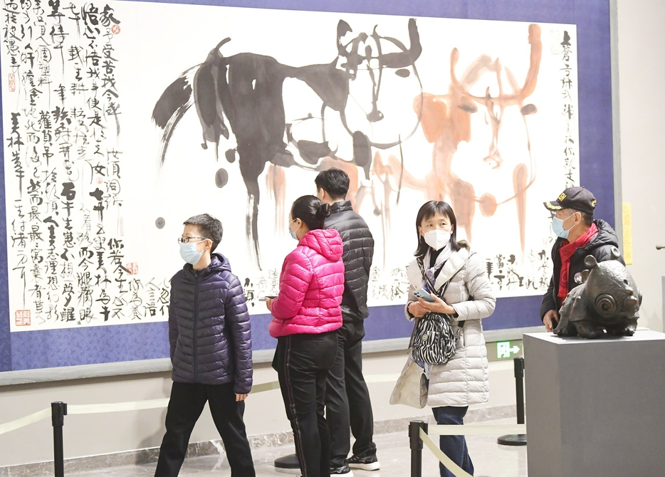 12月9日,众多市民在济南市美术馆参观“韩美林艺术展”。当日,距离“韩美林艺术展”闭幕仅有两天,又恰逢周末,馆内人气旺盛。此次是韩美林首次回到家乡举办展览。从济南走出的青葱少年,归来已是闻名遐迩的艺术大师,不少市民赶在闭展前来感受韩美林的艺术魅力。本周末,为期一个月的“韩美林艺术展”即将落下帷幕。在这一个月内,这位从济南走出来的中国当代艺术大师,用自己的作品为家乡奉献了一场艺术的饕餮盛宴,4个主题板块、近500件艺术珍品让济南市民在家门口就欣赏到了高水平的展览,使大家全面了解了韩美林的书法、绘画、雕塑、陶瓷等的艺术世界。 (本报记者崔健摄)