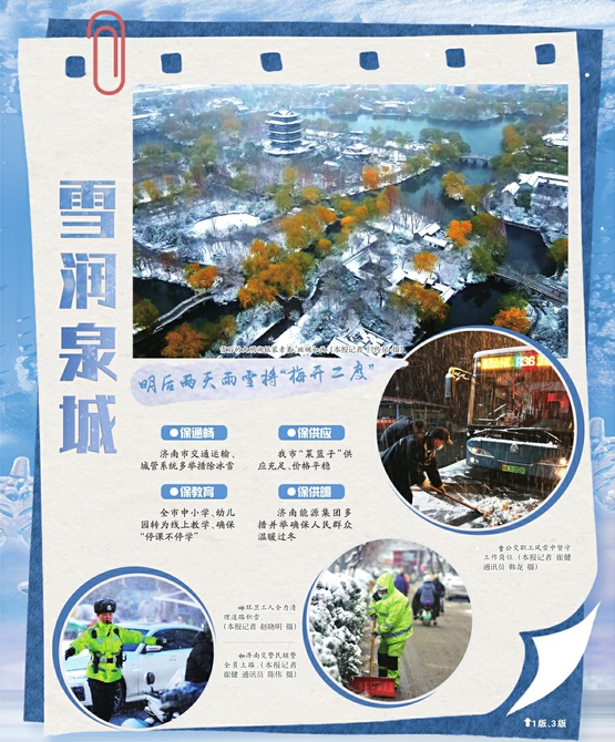 公交公司员工及时清扫车辆为乘客提供优质出行服务。 市民自发织组清除小区、单位附近道路积雪。市民清除车辆上的积雪。市民享受冰雪乐趣。(本报记者崔健赵晓明摄) 昨日,济南市出现了寒潮降雪天气。市交通运输、城管系统提前谋划,做好恶劣天气应对防范。 我市普通国省道除S317交警部门进行交通管制以外,其他道路通行正常,共投入应急人员800人,融雪剂519吨,应急设备195台套;高速公路通行正常,各收费站限行9座以上客车和危化品车辆,个别收费站封闭交通;农村公路通行正常,各区县除雪防滑工作正在持续进行,全力保障农村公路安全畅通。 目前在建城市道路停工,组织应急人员开始除雪作业。 协调机械化清扫大队、交警高架路大队协同做好严冬保畅工作。全面做好隧道清雪除冰,积极开展应急处置和设施维护。共出动巡查100余人次,车辆10台,配备除雪装备80余套,清理隧道口积雪10余处。 济南公交各级管理人员上站上线,前往冰雪湿滑路段实地勘查道路通行状况,采取区间车、大站快车、直达车、跨线支援、中段屯车等灵活有效的调度形式,提升车辆运行效率和线路运载能力,最大限度减少低温雨雪天气对市民正常出行的影响。 出租车驻站执勤人员24小时盯靠重要枢纽场站,预判车流情况,通过96576服务热线及时调度出租车,同时“泉城的士”车队准备五十辆应急车辆,随时驰援各站点,全力保障乘客走得了、走得好。 大雪如约而至,全市3.5万名城管干部职工立刻行动,各司其职,展开清雪除冰作业。据统计,全市城管系统累计出动3.5万余人,出动了洒水车1700余车次、大型滚雪车620余车次、小型清雪车480余车次、撒布机810余车次、推雪车80余车次、铲雪车100余车次、运输车70余车次,喷洒环保型融雪剂4900余吨。(本报记者戴升宝刘高君)