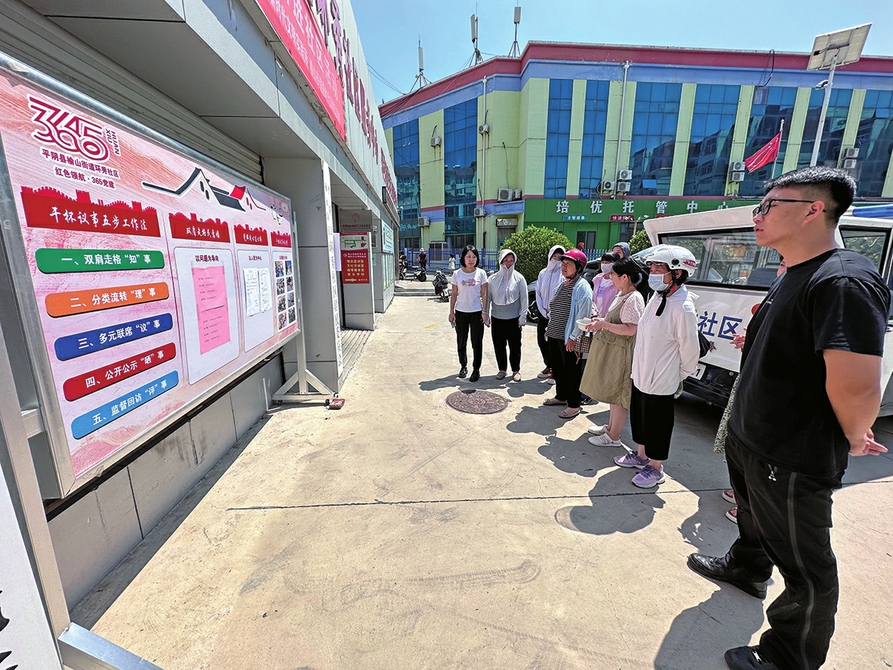 针对群众反映的诉求,相关部门赶赴现场协同处理。群众反馈问题的渠道更多元。城管在线“指尖”聚民意、“脚尖”察民情。了解群众诉求。 破损路面修复、屋顶防水整修、增设充电桩、处理下水道堵塞、解决消防通道被占用问题……平阴县榆山街道环秀社区把这些“基层议事”搬到了百姓家门口,一盏茶的工夫就能基本敲定解决方案。近年来,环秀社区积极探索12345热线办理机制,不断推进社区治理能力的提升和创新。 采访中,记者跟随12345热线工作人员走街串巷,他们“指尖”聚民意、“脚尖”察民情,从24小时在线的“幕后”和一次次风雨无阻的“抵达”中听民声、解民忧。党建引领 “热线+党建”解事儿 近年来,环秀社区创新“热线+党建”工作法——由党员带队,现场巡查解决疑难事项,确认承办单位归属问题,进一步提高诉求处置率。党员亮身份、亮承诺挂牌服务,展现党员风貌,提升热线形象。 “6号楼前边的绿化带里有不少垃圾,干扰了我们的生活,也不卫生!”市民王女士通过12345热线反映诉求。 接到居民反映后,榆山街道环秀社区第六网格书记江德兴二话不说,第一时间赶到现场。 经查看,现场确实存在垃圾死角,江德兴立即联系网格指导员及党员志愿者,联合物业工作人员对垃圾进行清理。问题解决了,社区环境更整洁了,附近经过的居民纷纷竖起大拇指称赞。 出现这样温暖人心的场景,得益于榆山街道环秀社区在街道党工委的引领下,持续推动“楼宇党建”机制落地,让党员亮身份,向居民作承诺,接受群众监督。 如今,来到环秀小区6号楼,细心的人会发现在单元入口规范设置的“党员公示牌”,这个楼栋党员的姓名、电话等一目了然。如此一来,社区便能通过“热线+党建”的服务模式更好地解决群众难题。 多方联动 职能部门“组团”办事儿 “露天垃圾池影响生活环境。” “这条路坑坑洼洼不好走,相关部门应该整修一下。” 随着老旧小区改造提升工程的深入推进,居民的生活品质得到显著提升,人们对优质生活环境的期待值也更高了。 “前段时间,环秀小区北区露天垃圾池的改善和清理成为居民关注的焦点,大家纷纷通过12345热线提意见。”工作人员介绍,为改善环秀小区北区环境问题,社区在收到12345热线工单后,组织力量填埋了露天垃圾池,并放置了多个垃圾桶。 “但是,这些办法并没有从根本上解决问题,还是有味道,清理也不及时。”采访现场,居民张先生介绍。社区了解居民诉求后,联系街道启动“乡呼县应”机制,县城管局等相关部门赶赴现场协同处理。在入户征求群众意见后,小区引入了垃圾分类站,设立了垃圾分类督桶员岗位,负责监督居民正确分类投放垃圾,确保垃圾及时清理。 “这样一来,我们身边的问题算是得到了彻底解决。”张先生笑着说,“大家伙儿都挺满意的”。主动作为 责任人“精准服务”圆事儿 “晚上9点多,突然停电,大家伙儿可急坏了。”此前,环秀小区8号楼居民王先生通过12345热线反映诉求。 环秀社区热线工作人员接到求助电话后,及时联系有关单位连夜抢修,恢复居民供电。为彻底解决小区供电线路老化的问题,当晚恢复供电后,社区又连续数日组织工作人员进行检查与维修。“我们入户给居民做工作,征求大家意愿,并统一解答了有关整修费用的疑虑,最终制定了方案,更换了新线缆,彻底解决了8号楼因线路老化频发断电、发生故障的问题。” 近年来,环秀社区把“被动服务”转变为“主动作为”,社区对通过12345热线反映的日常生活、交通出行、网上购物等方面的共性诉求,制定统一回复模板、办理方案,有效提高了群众诉求处置速度和办理质量,已重点解决环秀小区70号楼飞线、14号楼前路面破损、30号楼“危墙”等10项群众急难愁盼问题。 (文/图本报记者孙慧娟)【创新说】社区民意墙、回音壁架起党群“连心桥”:创新基层治理“抢答”群众诉求 近期,榆山街道环秀社区在传统社区治理模式上不断延伸,积极推进社区治理能力的提升和创新,在辖区设置民意墙、回音壁,群众通过民意墙反映问题,社区通过回音壁及时反馈落实情况,架起连心桥,打通人民群众感知公共服务质效和温度的神经末梢。 “我家小区前的绿化带垃圾太多,那天下班接孩子,看到民意墙,就把事写到上边了,没想到第二天绿化带就清理干净了。”家住环秀小区的张先生说。随着基层治理重心不断下沉,社区积极创新工作方式,畅通反馈渠道,社区党总支依据民意墙上群众反映的问题,统筹安排物业、楼长、志愿者等多方力量为居民解忧。 在民意墙的旁边是一块回音壁区域,社区收到了群众反映的问题,工作人员就会带着马扎、小桌、茶水来到居民楼下,举行一场“干杯议事会”。环秀社区党总支负责人说,“干杯议事会”这种议事形式自开展以来很受居民欢迎,在大家最常去的乘凉拉呱的地方,跟居民拉拉呱,说说老百姓身边的大事小情,喝着茶就把百姓的烦心事解决了。
