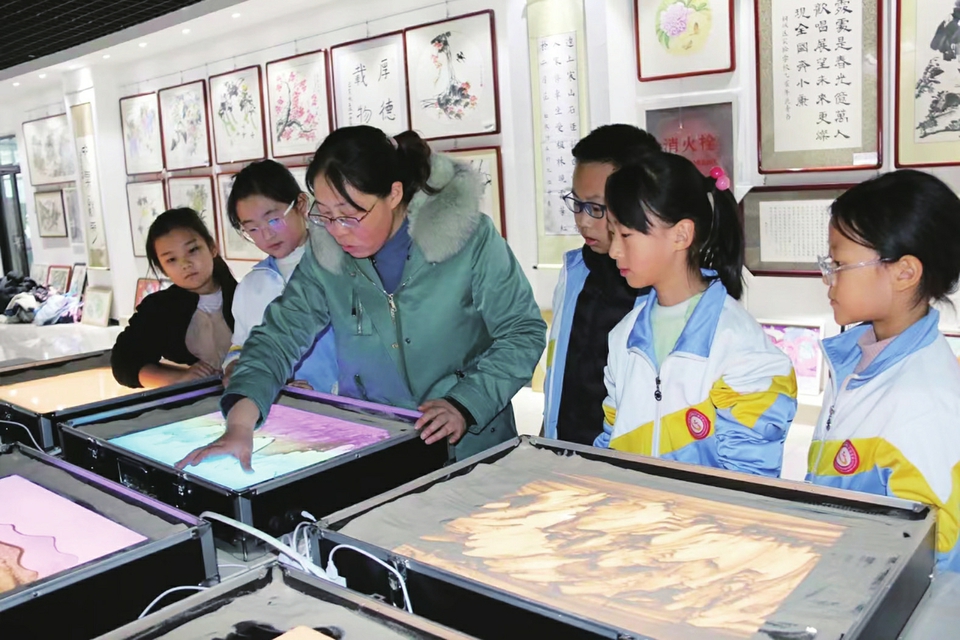 沙画社团的同学们在老师的指导下练习沙画。 近日,钢城区教体系统四“泉”行动现场会走进钢城区实验学校。活动现场,鼓声有节奏地响起,宛如天籁之音,钢城区实验学校的空灵鼓社团吸引了大家纷纷驻足。如此奇特小众的乐器,孩子们是如何熟练掌握的?这得益于学校的课后延时服务。 今年年初“四”泉行动启动后,钢城区实验学校为将美育进一步向前推进,弘扬中国民族音乐文化,创立了空灵鼓社团。空灵鼓并不是常见的乐器,学校没有专业的教师,音乐教师任霞便自告奋勇,担任指导老师。凭着对空灵鼓的喜爱,她在课余时间不断钻研学习,研究空灵鼓的演奏技巧,还结合传统音乐文化元素,将其融入到自己的社团音乐教学中。 空灵鼓社团的成立吸引了不少爱好音乐的同学,从兴趣出发,学校在三年级选拔出了30名有基本乐理知识的学生加入。经过短短一个学期的学习,空灵鼓社团团员们对空灵鼓这件乐器越发喜爱,每周一、周二的课后延时活动中,空灵鼓社团座无虚席。目前,学校开放日、艺术节上都有了空灵鼓社团孩子们的身影,他们的表演经常赢得观众的阵阵掌声。 除了空灵鼓演奏,钢城区实验学校还有一群“小小沙画家”。普通的沙子到了孩子们手中瞬间就能变出各种图案,山水花草、抽象图案,无不惟妙惟肖、令人遐想,这便是钢城区实验学校的沙画社团。 沙画社团开展活动已经有几年时间了。社团刚成立时,沙画还是个新鲜事物,学校没有教沙画的老师,美术老师张艳丽利用暑假时间去烟台学习了沙画创作。开学后,沙画社团就正式成立了。 每周四、周五两课时的课后延时活动中,学校沙画社团的成员都相聚在沙画室学习,几年的持续学习,让一批又一批的成员从最基本的抹沙、撒沙到后期的挥洒自如。古诗词、二十四节气、行走大汶河等主题创作都是社团成员们的得意之作,社团成员也多次受邀参加各类活动的现场展示。“以沙为墨、以指代笔,我渐渐体会到沙画课程中不仅有画,还有美与爱。”钢城区实验学校五年级九班的李玮辰同学通过学习圆了自己的沙画梦。 武术操、象棋、手势舞、烹饪食育……除了沙画和空灵鼓社团,钢城区实验学校现有15门课后延时课程。每天下午的课后延时服务,学校15个音体美信教师便开始忙碌,整个学校也变得热闹活跃,每一个参与者都乐在其中。 近年来,钢城区实验学校充分发掘教师智慧潜能,利用教师经验、特长、兴趣爱好,全员参与、共同开发;同时,全面发挥功能教室、运动场地等优势,根据学生的兴趣和爱好,打破班级和年级界线,组织开展形式灵活、内容丰富的课外延时活动。同学们不断挖掘自己的潜力,陆续解锁新才艺,在提高综合素质的同时,大大增强了对学习、对未来的信心。 (本报记者高明通讯员李文娟)
