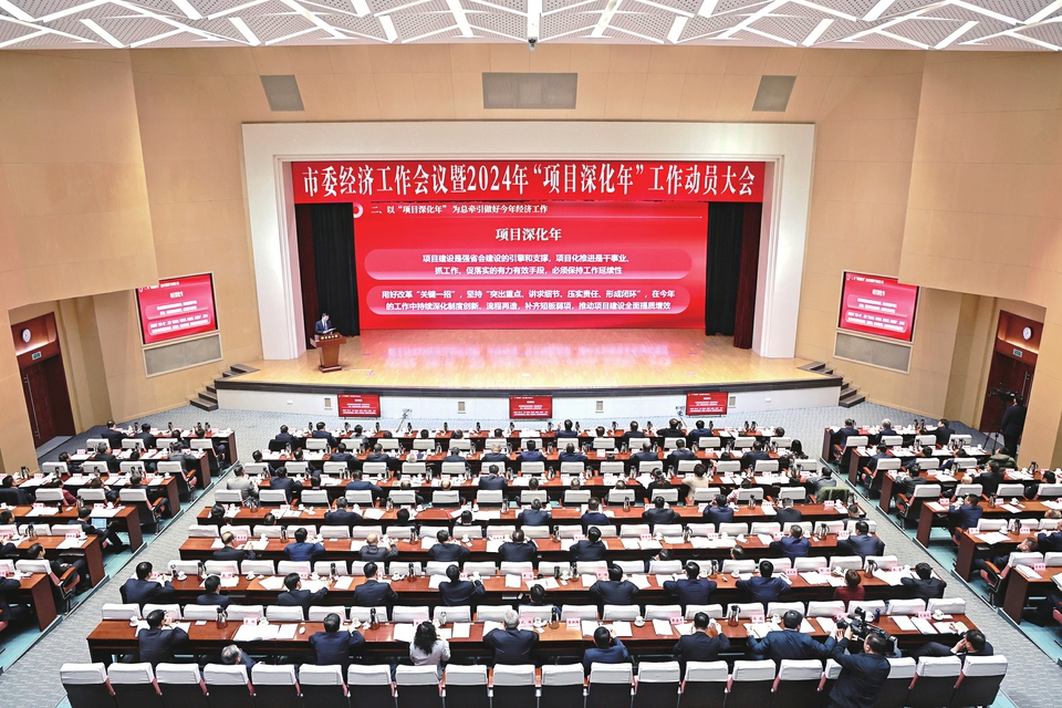 1月2日,市委经济工作会议暨2024年“项目深化年”工作动员大会召开。(本报记者张一摄) 本报1月2日讯(记者王端鹏林江丽)今天,市委经济工作会议暨2024年“项目深化年”工作动员大会召开。会议以习近平新时代中国特色社会主义思想为指导,深入贯彻落实党的二十大和中央经济工作会议精神,贯彻落实省委十二届五次全会暨省委经济工作会议精神,总结2023年经济工作,部署2024年经济工作。 市委书记刘强主持并讲话,市委副书记、市长于海田总结2023年全市经济工作,对2024年全市经济工作作出安排部署;市人大常委会主任韩金峰、市政协主席雷杰、市委副书记杨峰出席。 与会代表在会前观看了2023年全市经济社会发展回顾专题片。于海田与区县(功能区)、市直部门、市属企业签订2024年度重点目标任务责任书;有关单位代表围绕落实2024年目标任务作书面发言。 会议指出,2023年以来,面对艰巨繁重的改革发展稳定任务和经济下行压力,全市上下坚持以习近平新时代中国特色社会主义思想为指导,全面贯彻党的二十大精神和习近平总书记对山东、对济南工作的重要指示要求,按照省委工作要求,以“项目突破年”为总牵引,坚持项目化、清单化、工程化推进工作,推动全市经济运行“持续向好、量质齐升”,“强新优富美高”新时代社会主义现代化强省会建设迈出坚实步伐。特别是动态谋划的“十大领域”绿色低碳高质量发展重大项目库,由去年年初的1301个项目调增至2363个,2023年年度计划投资3123.4亿元,1-11月投资完成率近120%,“项目突破年”交出了合格答卷。 会议强调,2024年是促进经济巩固向好、加快绿色低碳高质量发展的关键一年,也是实施“十四五”规划、推进强省会建设的关键一年。要坚持以习近平新时代中国特色社会主义思想为指导,全面贯彻落实党的二十大和中央经济工作会议精神,深入落实习近平总书记对山东、对济南工作的重要指示要求,坚持稳中求进工作总基调,完整、准确、全面贯彻新发展理念,主动服务和融入新发展格局,加快推动高质量发展,全面深化改革开放,统筹扩大内需和深化供给侧结构性改革,统筹新型城镇化和乡村全面振兴,统筹高质量发展和高水平安全,以“项目深化年”为总牵引,纵深推进数字济南、工业强市建设,推动全市经济实现质的有效提升和量的合理增长,切实保障和改善民生,不断开创“强新优富美高”新时代社会主义现代化强省会建设新局面。 会议指出,要扭住“项目深化年”这个“总牵引”,全力推进项目谋划建设提速加力。2024年,我市对绿色低碳高质量发展项目体系进行完善提升,更加突出项目的落地导向、产业导向和对投资的支撑力,确定重点项目2000个,总投资2.66万亿元。 会议指出,推进“项目深化年”,要在项目谋划、落地、建设、见效、服务等五个环节上做到“三看三深化”。在产业项目谋划上,要看项目是否体现新发展理念,看与本地主导产业的关联度强不强,看对各类资本的吸引力强不强,深化按图索骥、建立产业项目“揭榜挂帅”机制,深化质量管理、完善项目谋划评价体系,深化奖励激励、提升谋划策划项目积极性。在项目落地上,要看项目实施主体是否明确,看前期准备工作是否充分,看要素保障是否到位,深化完善项目落地手续“预办理”制度,深化完善“四个并联”审批机制,深化完善项目要素保障机制。在项目建设上,要看工作组织,看推进效率,看投资质量,深化问题解决闭环机制,深化对行业主管部门的投资考核机制,深化项目建设和投资工作统筹机制。在项目建成达效上,要看是否按期投入运行,看是否达到预期目标,看是否具有综合效益,深化项目建设和周边配套“双同步”机制,深化全市统一的产销对接平台建设,深化完善项目建设后评估机制。在项目服务上,要看颗粒度,看专业度,看满意度,深化完善“泉惠企”和12345热线问题解决机制,深化完善惠企政策落实机制,深化完善项目建设的法治保障。 会议强调,要实现八个“新提升”,努力塑造高质量发展新优势。多措并举扩内需稳外需,聚力在推动经济持续向好上实现新提升;坚定不移壮大实体经济,聚力在加快构建现代化产业体系上实现新提升;持之以恒深化改革、扩大开放,聚力在激发高质量发展动力活力上实现新提升;全力推进数字济南建设,聚力在打造数字先锋城市上实现新提升;高水平推进城市建设管理,聚力在优化城市功能品质上实现新提升;坚持不懈抓好“三农”工作,聚力在全面推进乡村振兴上实现新提升;全面加强生态环境保护,聚力在厚植高质量发展绿色底色上实现新提升;千方百计增进民生福祉,聚力在推进共同富裕上实现新提升。 会议强调,要切实凝聚推动项目深化的工作合力。要建强用好项目在线监测平台,及时跟上服务,督导项目进展。要压紧压实责任,市级领导同志要率先垂范、以身作则,市直各部门单位要提供全生命周期服务,各区县(功能区)和各经营主体要扎扎实实做好项目建设各项工作。要加强考核督导,推动目标任务落实。要强化能力作风保障,锤炼过硬作风,加强能力建设,营造良好氛围。 会议号召,全市上下要更加紧密地团结在以习近平同志为核心的党中央周围,坚持以习近平新时代中国特色社会主义思想为指导,坚定信心、开拓奋进,推动“项目深化年”各项工作取得扎实成效,不断开创“强新优富美高”新时