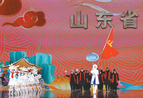 2月17日,山东省体育代表团在开幕式上入场。当晚,第十四届全国冬季运动会开幕式在内蒙古呼伦贝尔市海拉尔区内蒙古冰上运动训练中心举行。(新华社发)