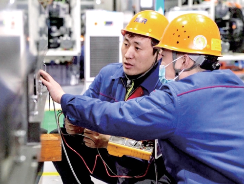 2月18日,济南二机床数控自动化生产车间内,工人们正在对产品进行检测。(本报记者 陈长礼 摄)