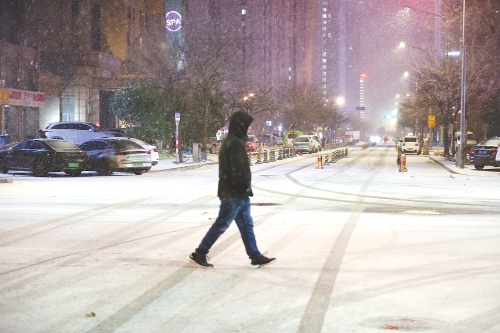 2月20日晚,受西南暖湿气流和冷空气共同影响,泉城普降春雪,人们顶风冒雪出行。 (本报记者 吕传泉 摄)