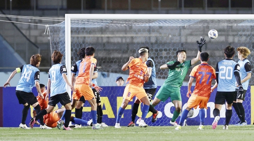 2月20日,川崎前锋队守门员郑成龙(右四)未能扑出山东泰山队球员贾德松(左二)的射门。(新华社发)