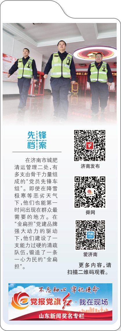 说起这支“党员先锋车组”,就不得不提历城清疏大队党支部。该党支部有一个响亮的党建品牌——“金扁担”。一提起扁担,就会让人想起挑粪工人、“全国劳动模范”时传祥的形象:他独自一人推着独轮粪车,肩挑粪担、挨家挨户清掏粪坑。时过境迁,虽然城市的粪污处理方式早已发生翻天覆地的变革,清疏工也无需再挑着扁担走街串巷,但“宁愿一人脏,换来万家净”的扁担精神却一直传承着。