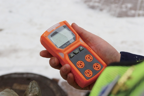 放置防护栏、检查设备、掏出沼气检测仪……一整套动作熟练干脆,待准备工作完毕,他们的目光紧紧盯着地上的三个检查井盖。