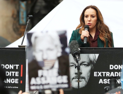 2月21日,在位于伦敦的英国高等法院外,阿桑奇的妻子斯特拉参加集会活动。(新华社记者 李颖 摄)