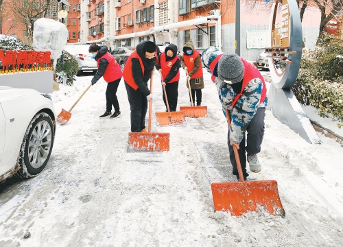2月21日、22日两天,七里山街道七东社区积极组织社区工作人员、红十字会志愿者,在辖区开展清雪除冰,为居民开辟“绿色通道”。(本报记者 赵晓明 摄)