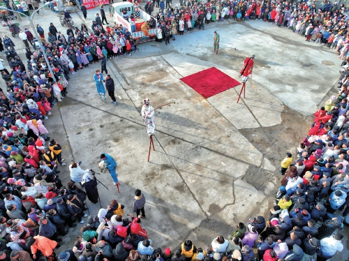 2月22日,雪后泉城天气放晴。在云锦晚市上,现场气温仅-4℃,民间艺人高跷表演热情高涨,有数千人围观,皆被民俗魅力所吸引。伴随着此起彼伏的锣鼓声、欢笑声,观众席上掌声不断,场面十分壮观。 (济南报业全媒体记者 王汗冰 摄)