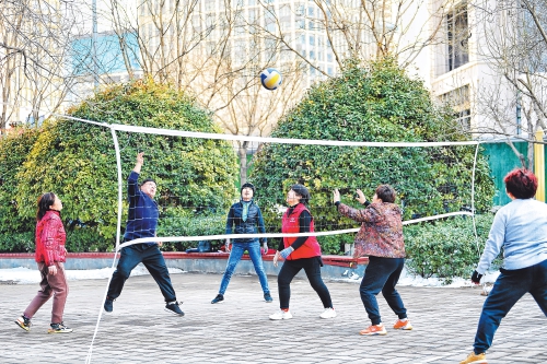 早春时节的兴福寺公园里,排球场上传来欢乐的笑声,成为春日里的一道风景。 (王汗冰 摄)
