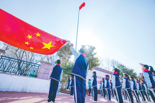 2月26日,在济南市第十四中学操场上,师生们一起参加升旗仪式。 (黄中明 摄)