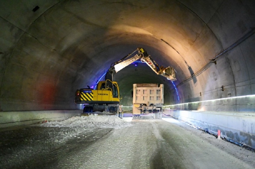 在乌鲁木齐至尉犁高速公路5标段(隧道入口端),工程车辆在主洞清理道路积冰(2月20日摄)。 (本组照片均为新华社记者 丁磊 摄)