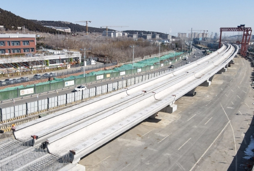 3月1日,在济南经十东路与彩龙路交叉口西侧的济南轨道交通8号线项目一期工程建设现场,一段东高西低的高架箱梁已经架设完成。据了解,济南轨道交通8号线采用地下段与高架段相结合的方式建设,该段箱梁的西首将与轨交8号线的地下段相通,地铁列车可从这里驶上高架段轨道。截至目前,轨交8号线高架段墩柱施工完成75%,U梁预制生产完成60%,架设完成31%;地下段5台盾构机全部始发,正稳步向前推进。