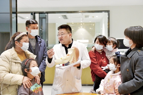 3月3日,在山东省第二人民医院,徐磊医生在为接受OTOF基因治疗的患儿及其家长介绍讲解耳朵模型。