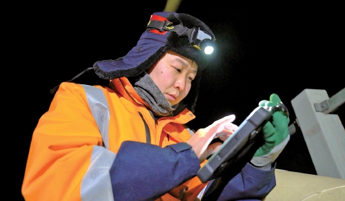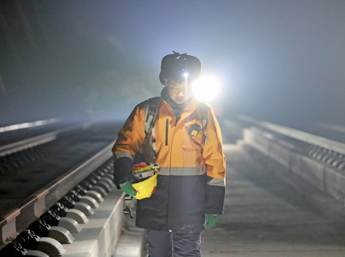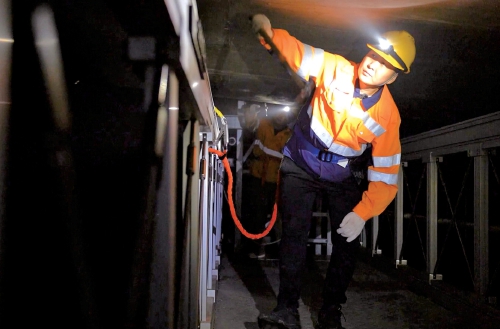 高铁大桥的维护是一个系统性工程,牵一发而动全身。春运期间黄河水汽侵蚀、昼夜温差大,加之高铁的高速运行,设备难免会出现一些细微变化。检修队要利用夜间的天窗期,重点对大桥桥梁底部的混凝土层面进行检查。大桥梁底距离黄河水面17米,每次检修他们都要穿戴好防护用具,借助头灯的微光通过只有一米半宽的梁梯下到距轨面13米的检查台车上,每移动两步就要重新扣一次安全绳。寂静的深夜里,耳边只有身下滚滚流淌的黄河水声和金属卡扣的相撞声不时回响。检查台车离轨底面仅有一米半,他们在上面不能直起身子,只能俯腰侧身检查近50米的桥底,每隔几分钟,大家就要蹲下歇一歇。大桥上没有遮挡物,伴随着呼啸的寒风和脚下滚滚黄河水,检查台车不停摇晃,最大幅度能有30度。长期从事这项工作的他们,早已练就听声辨“伤”的本领,用检查锤对桥梁梁底的混凝土进行敲击,如果发出清脆的声音,就能确定这一块混凝土结构紧实没有问题。